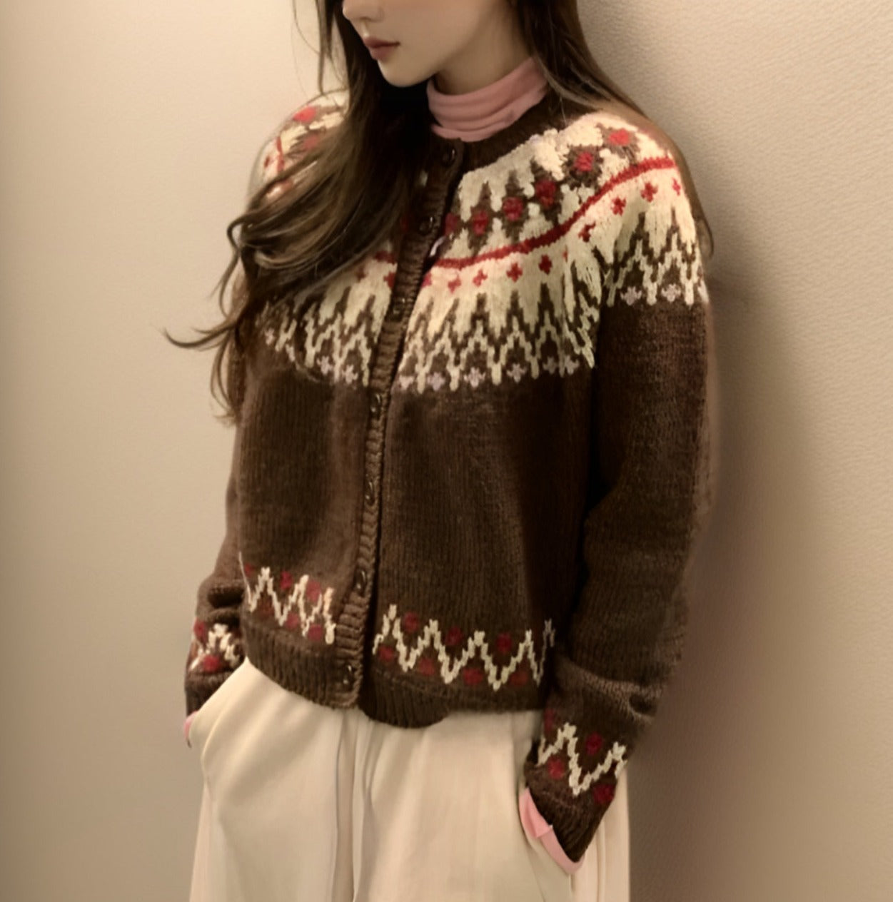 Um die Langlebigkeit Ihres Pullovers zu gewährleisten, waschen Sie ihn bei niedriger Temperatur und lassen Sie ihn an der Luft trocknen. Vermeiden Sie direkte Sonneneinstrahlung, um die Farben zu schützen.