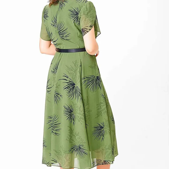 Fließendes Kleid mit Blattmuster, weichen Flatterärmeln und einem taillierten Gürtel!