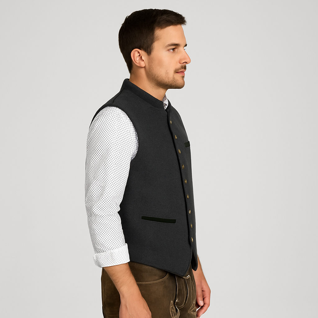 Die Weste Carl ist auf langlebigen Tragekomfort ausgelegt und vereint Vintage-inspirierte Ästhetik mit einer modernen, taillierten Silhouette. Die geknöpfte Vorderseite und die dezenten Akzente verleihen ihr einen eleganten und eleganten Look, egal ob zu Lederhose oder Jeans.