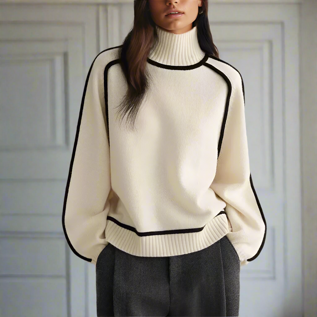 Das entspannte Design und der kontrastierende Besatz entlang der Schultern verleihen einer klassischen Silhouette eine moderne Note. Perfekt zum Schichten, passt dieser Pullover mühelos zu maßgeschneiderten Hosen oder Ihrer Lieblingsjeans für einen lässigen, aber polierten Look. Die weiche Textur sorgt für Wärme ohne Atmungsaktivität zu opfern, was ihn ideal für den ganztägigen Tragekomfort macht.