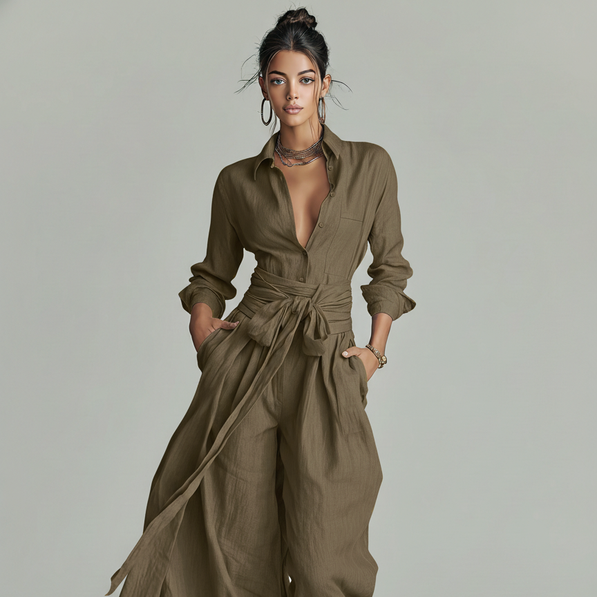 Damen Jumpsuit aus Leinenmischung mit Gürtel & Hemdkragen – Leinen Overall 2026