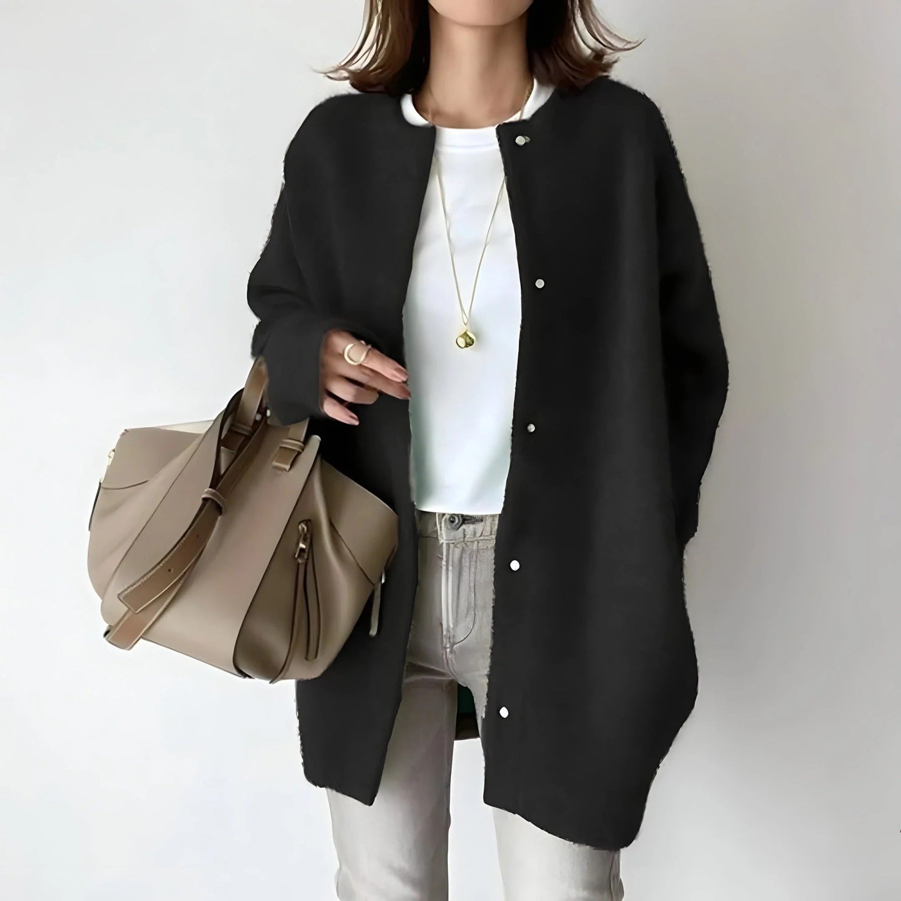 Dieser strickjacke hat einen gerundeten, kragenlosen Ausschnitt und fällt bis zur Mitte der Oberschenkel. Er verfügt über eine Knopfleiste vorne mit mehreren hellen Knöpfen. Das Strickmaterial hat eine dezente Textur im gesamten Kleidungsstück. Die Ärmel sind lang und reichen bis zum Handgelenk.