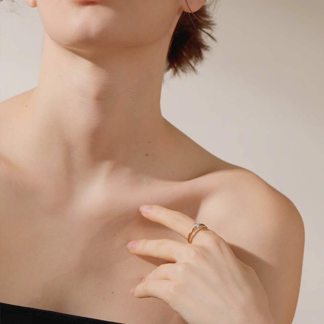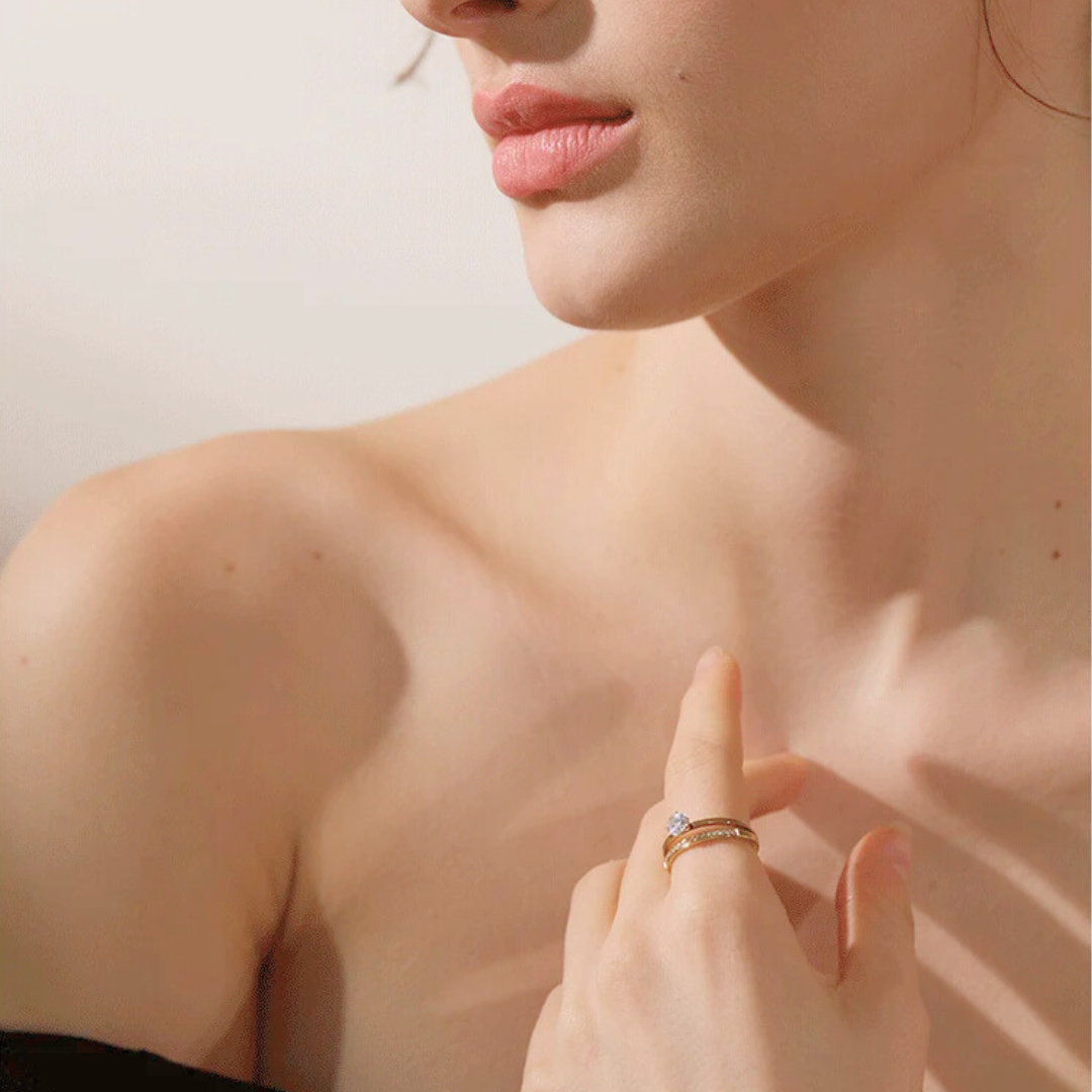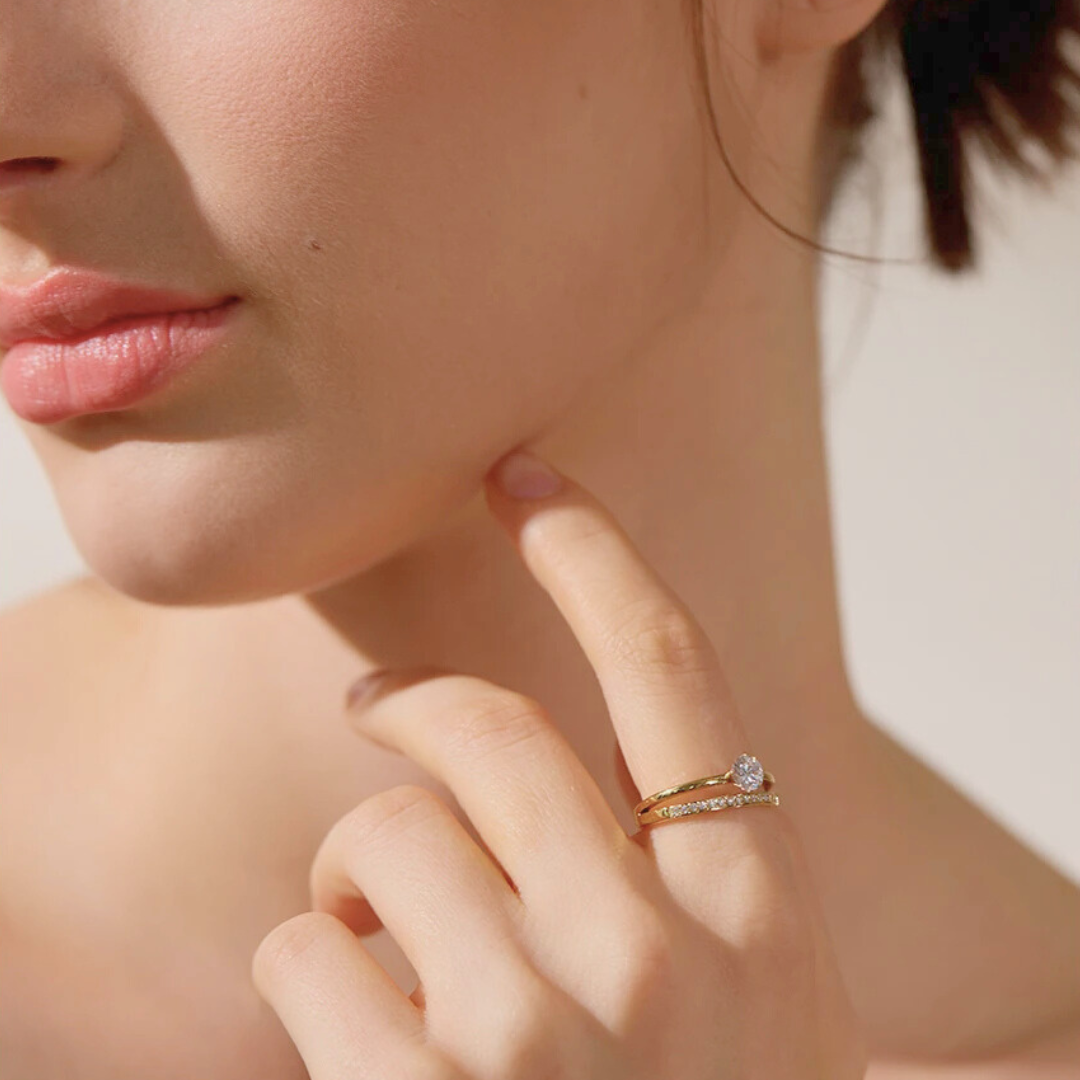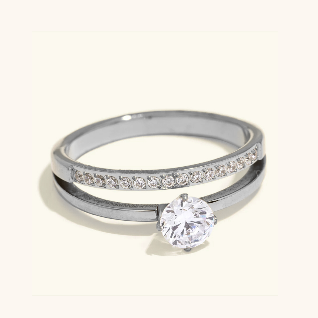 Ein moderner Doppelring mit klarem Mittelstein und einer Reihe kleiner Akzente. Ausgewogen, minimalistisch und vielseitig kombinierbar – passt sowohl zu legeren als auch zu eleganten Looks.