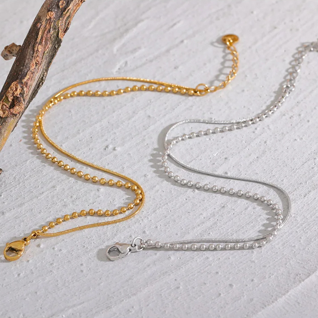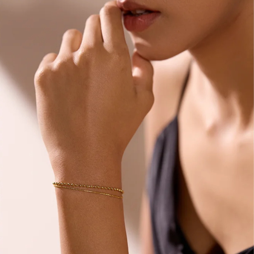 Ein zartes und stilvolles zweilagiges Kettenarmband mit einer Kombination aus glatten und perlenbesetzten Ketten. Mit verstellbarem Karabinerverschluss gestaltet, ist dieses Stück perfekt für den Alltag oder besondere Anlässe.