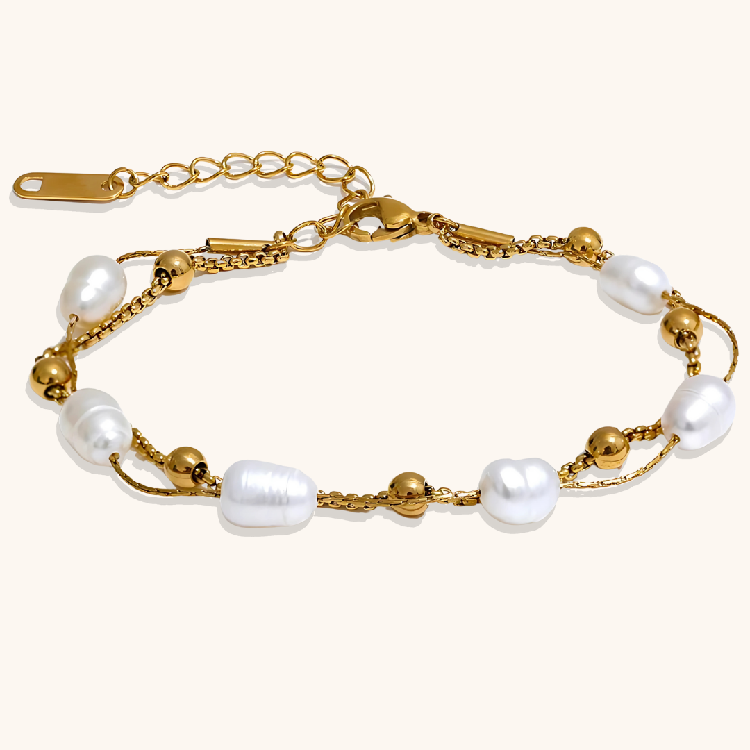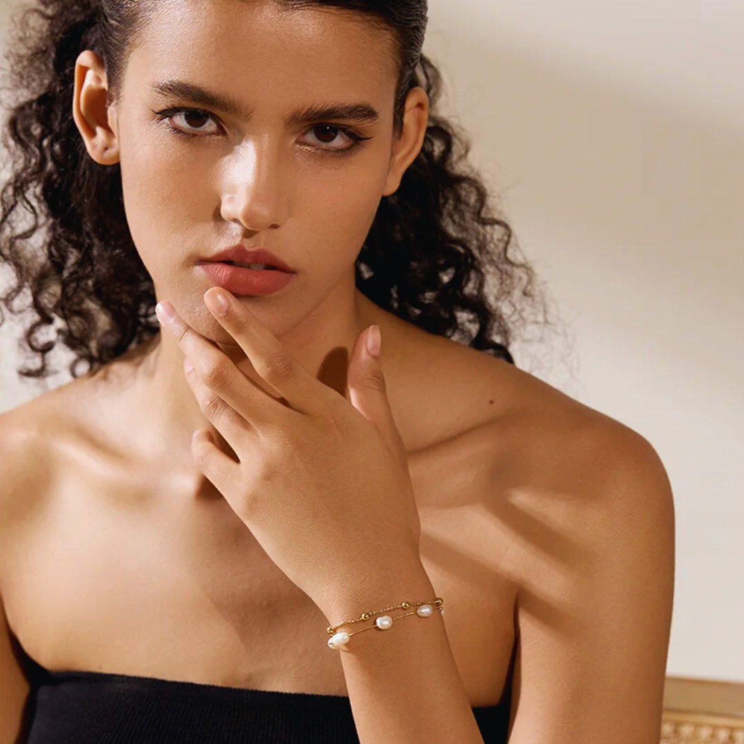 Ein leichtes und elegantes Armband mit zwei übereinanderliegenden Ketten und einem Herzanhänger. Für den täglichen Gebrauch gemacht — sicher, schlicht und vielseitig kombinierbar.