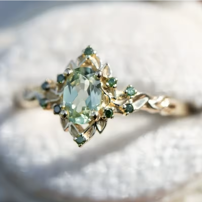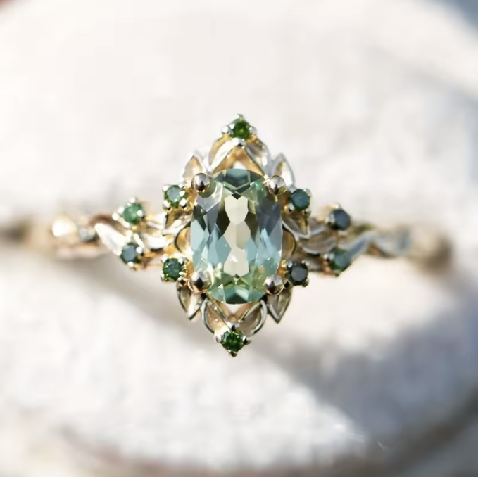 Ein atemberaubender tief aquafarbener Mittelstein, umgeben von silbernen Blätterdetails und leuchtend grünen Akzenten. Das gedrehte Band verleiht einen einzigartigen, vintage-inspirierten Touch, der ein typisches Sundelle-Design ausmacht.