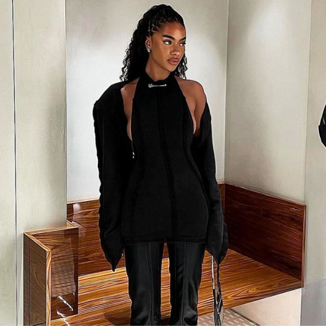 • Modernes Design: Mit einem Halter-Ausschnitt und einem einzigartigen Patchwork-Strickmuster heben Sie sich von der Masse ab.