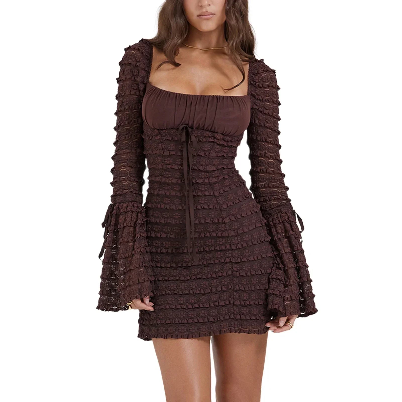 Dieses bezaubernde Kleid vereint romantische Details und modernem Chic. Mit seiner mehrlagigen Spitze und den transparenten Glockenärmeln ist es die perfekte Wahl für besondere Anlässe oder romantische Abendveranstaltungen. Es richtet sich an modebewusste Frauen, die das Besondere suchen und einen Hauch von Nostalgie lieben.