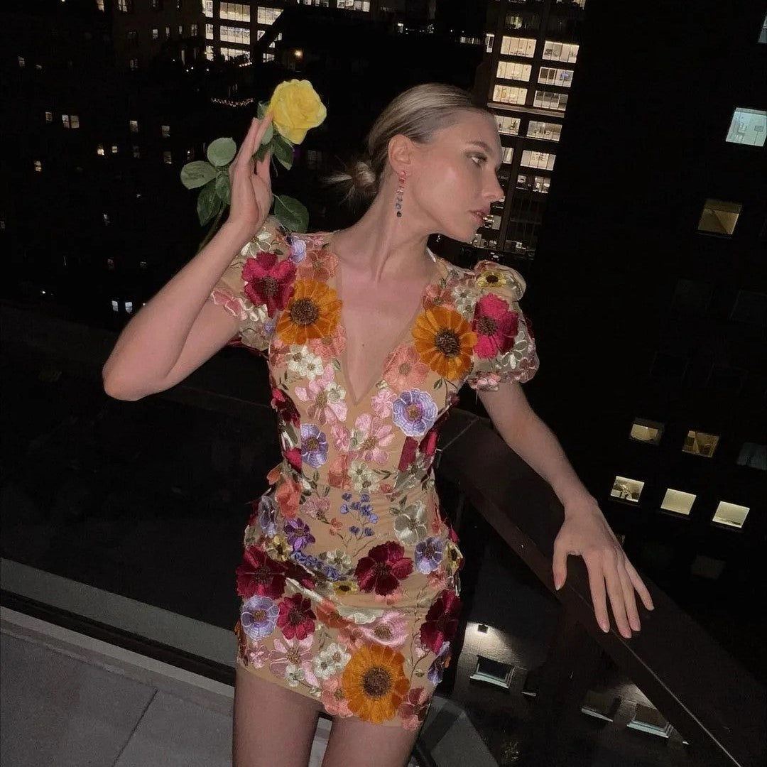 Elegantes Heidi -Minikleid mit Blumen und Puffärmeln