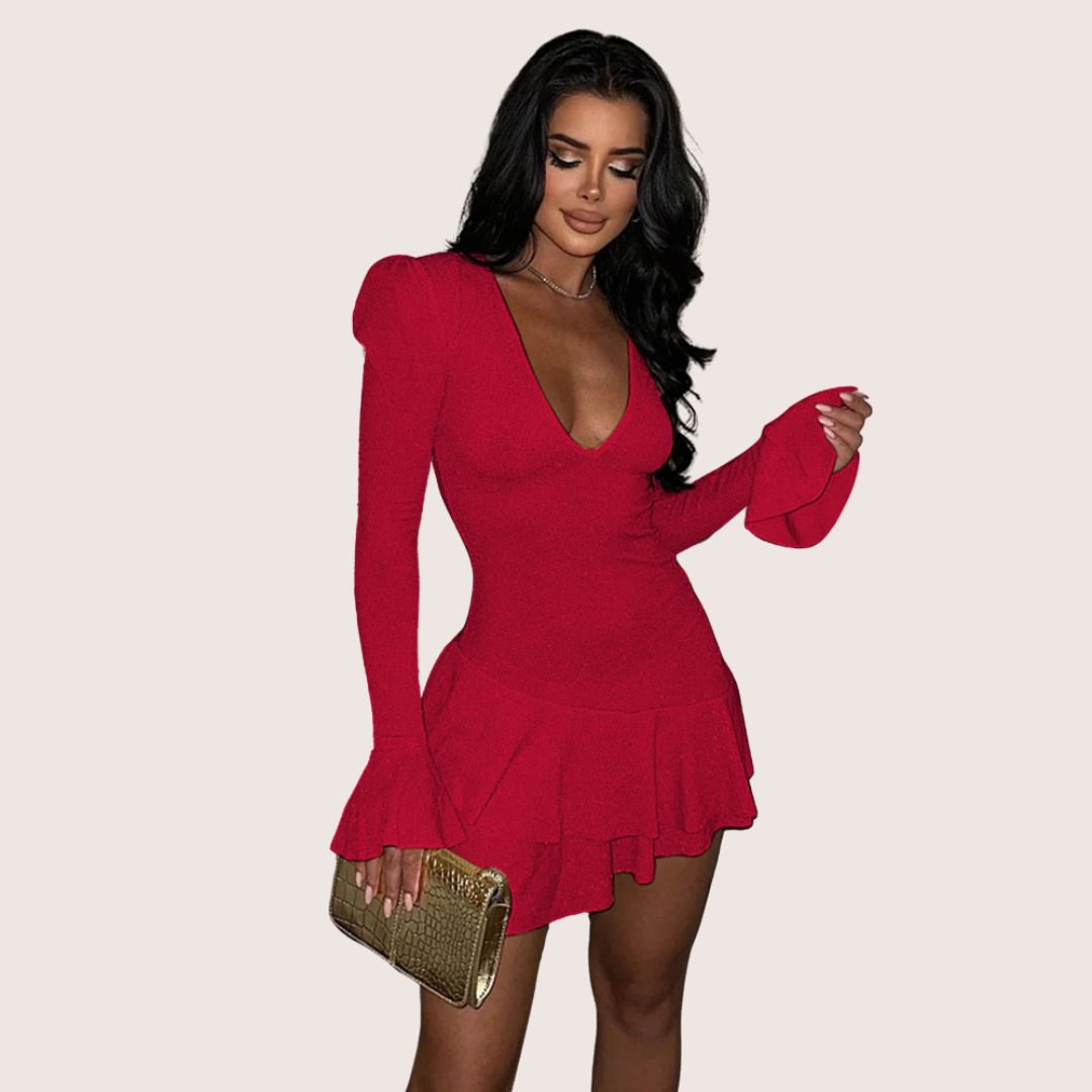 Dieses trendige Kleid ist perfekt für alle, die einen stilvollen Auftritt möchten. Es kombiniert einen tiefen V-Ausschnitt mit verspielten Rüschen, um Ihrer Figur schmeichelhaft zu schmeicheln. Ideal für Partys oder besondere Anlässe, ist es ein Must-Have für modebewusste Frauen, die Eleganz und Komfort schätzen.