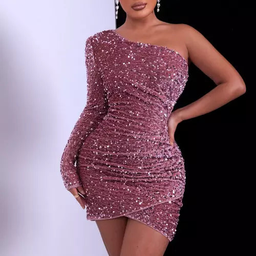 Dieses Kleid ist eine perfekte Wahl für besondere Anlässe und Veranstaltungen. Mit seinem modernen One-Shoulder-Design und den glitzernden Pailletten hebt es jeden Look hervor. Ideal für Damen, die sich von der Masse abheben möchten. Egal, ob für eine Cocktailparty, eine Gala oder einen festlichen Abend – dieses Kleid sorgt dafür, dass Sie im Mittelpunkt stehen.