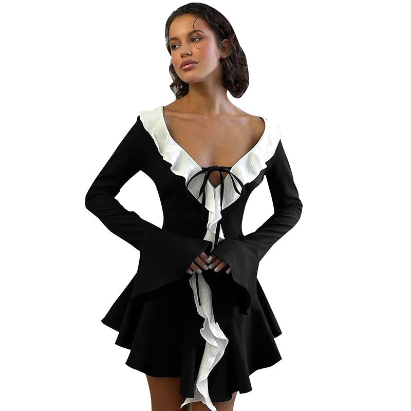 Dieses Kleid ist die perfekte Wahl für Frauen, die nach einem vielseitigen und modischen Outfit suchen. Es eignet sich ideal für verschiedene Anlässe, sei es für eine Feier, ein Date oder einfach für den Alltag. Der Rüschenschnitt und die Glockenärmel verleihen dem Kleid einen besonderen Charme, während der V-Ausschnitt die Figur vorteilhaft betont.