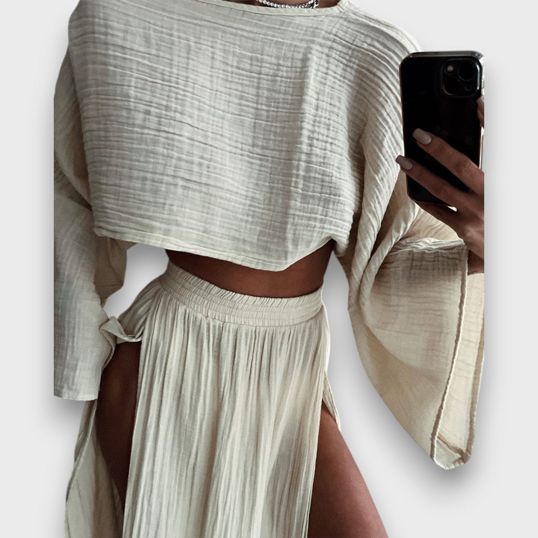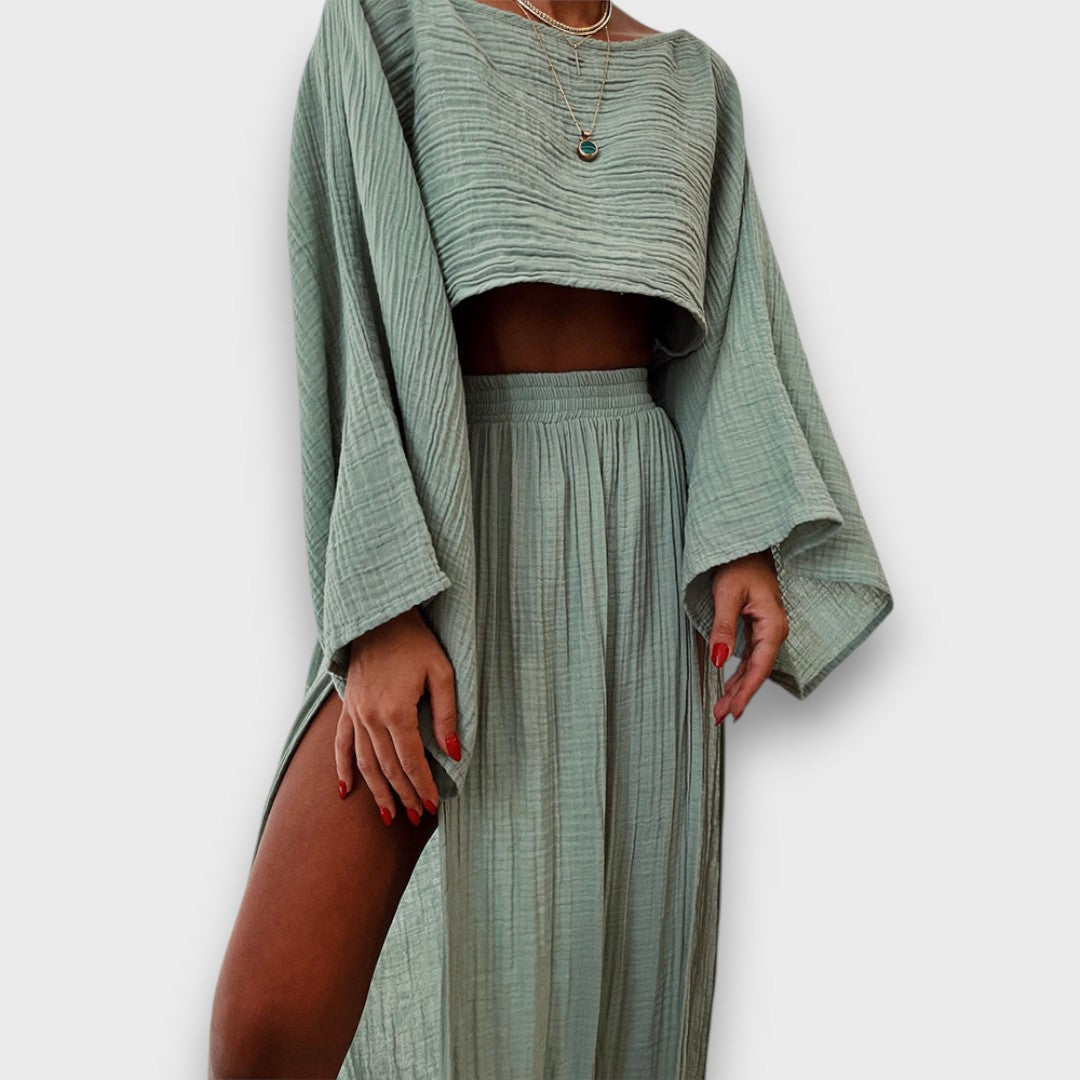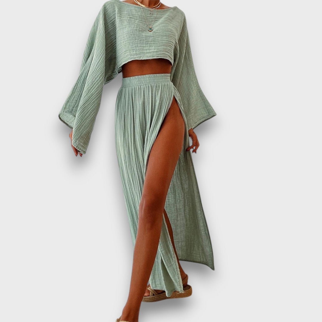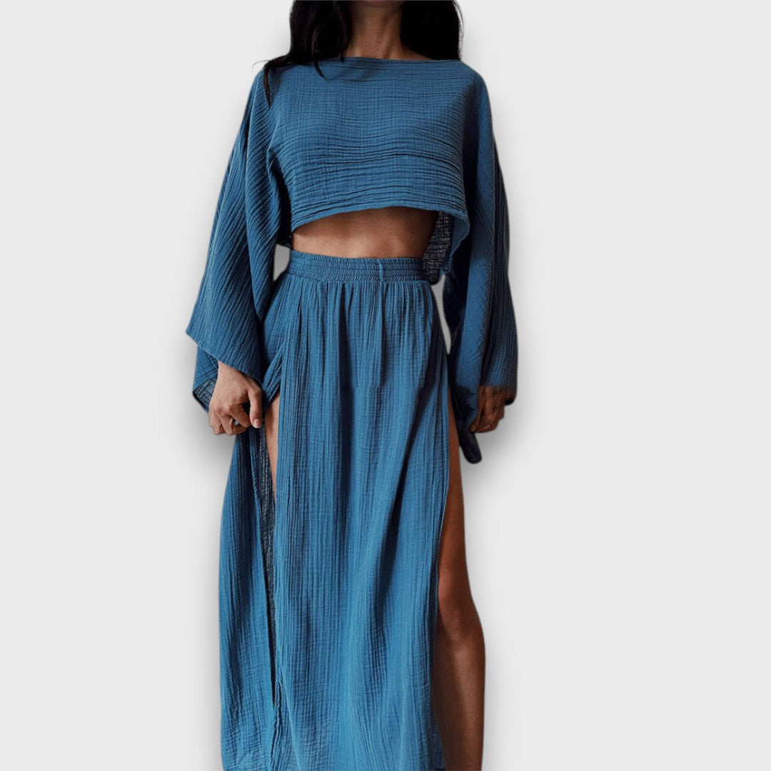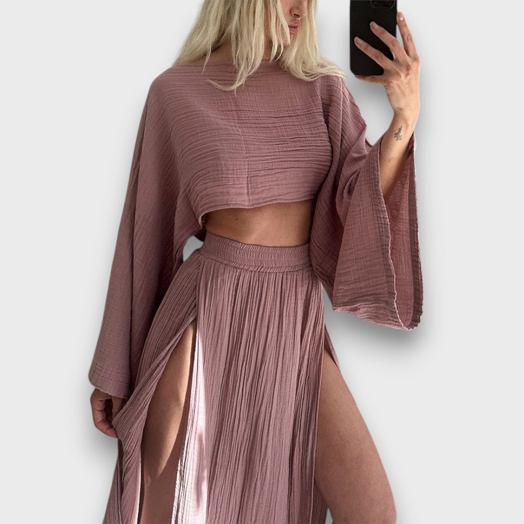 Elise ist ein Set, das sich mit dir bewegt – leicht, stilvoll und ganz ohne Anstrengung. Der lockere Schnitt umhüllt den Körper sanft, während seitliche Schlitze bei jedem Schritt einen Hauch von Rhythmus einbringen. Ein Look, der Raum lässt – und genau dann gut aussieht, wenn du es brauchst.