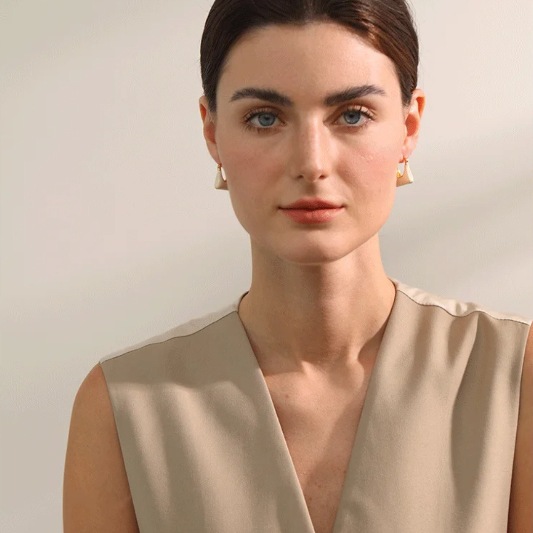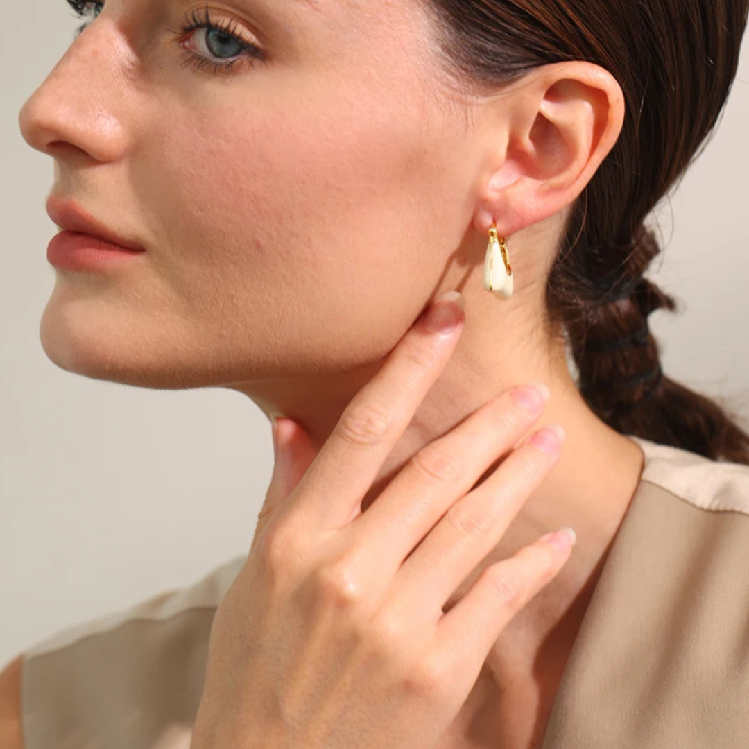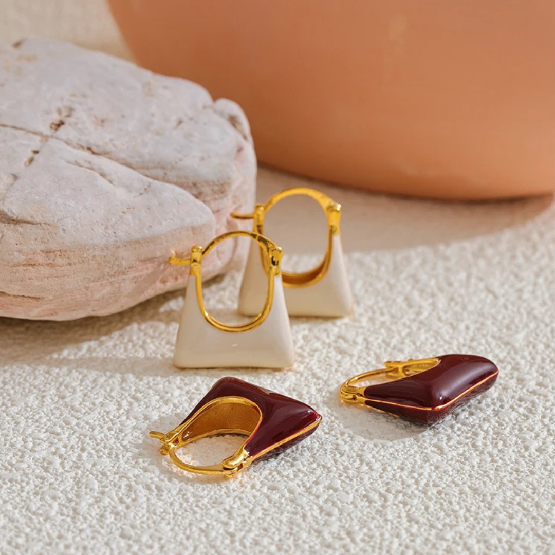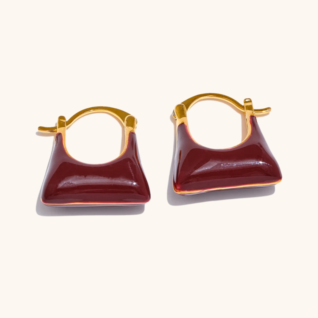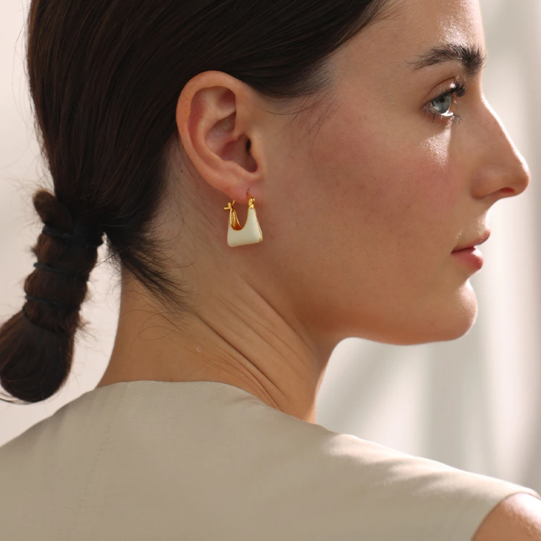 Ein verspieltes Paar Emaille-Steckerohrringe in Form von Mini-Shoppern, mit sanften Kurven und glänzendem Finish. Diese geometrischen Stücke verleihen Alltagsoutfits Charme und bringen einen modernen Twist in deine Schmucksammlung.