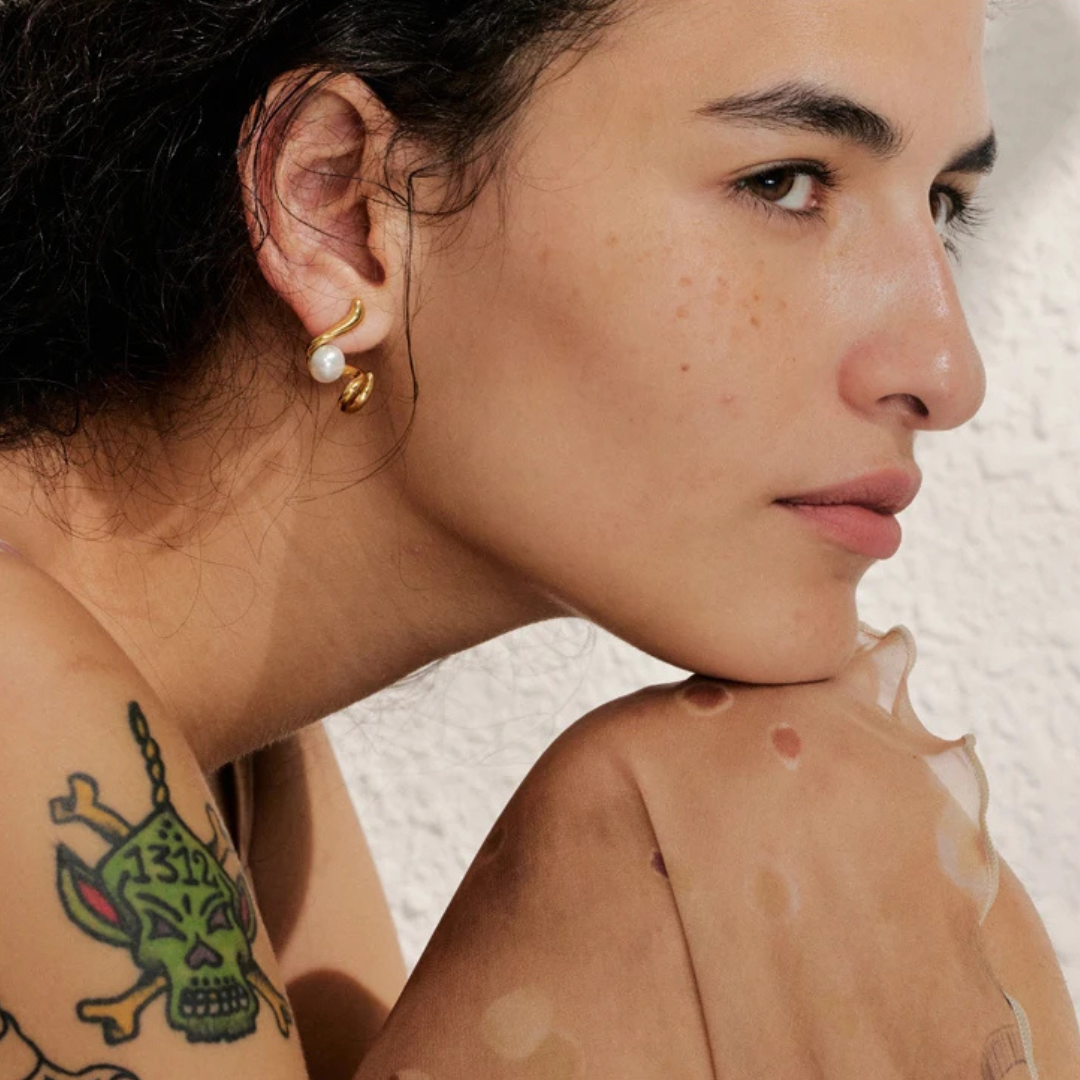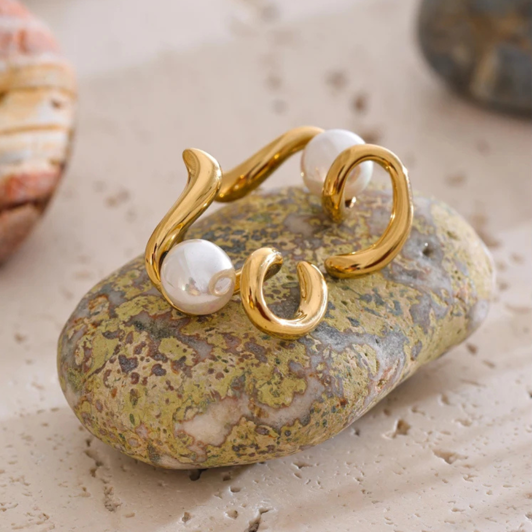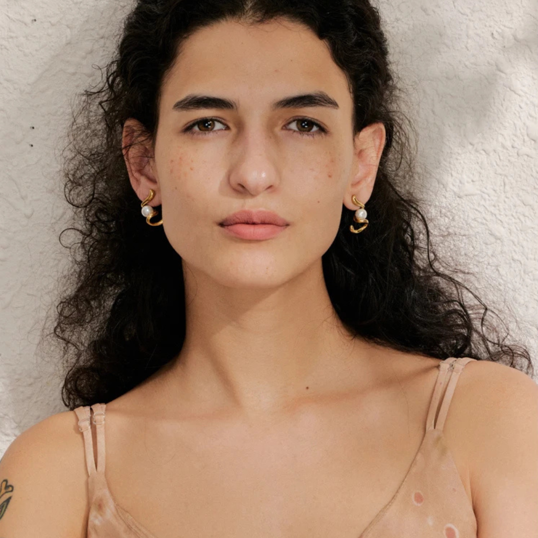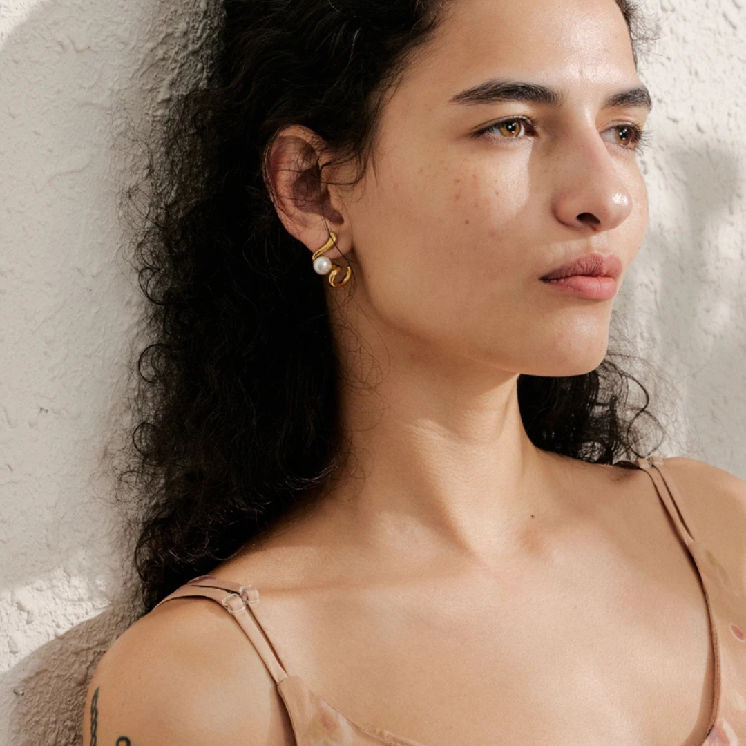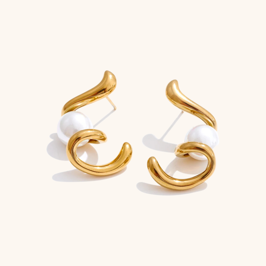 Ein verspieltes Paar Ohrringe, das mit seiner einzigartigen, gedrehten Form und einem perlenähnlichen Akzent hervorsticht. Das unregelmäßige Design verleiht einen modernen, künstlerischen Touch, ohne übertrieben zu wirken — lässt sich leicht zu lässigen oder eleganten Outfits kombinieren.
