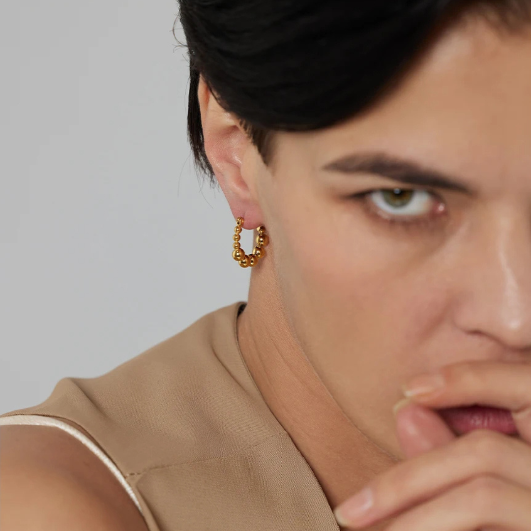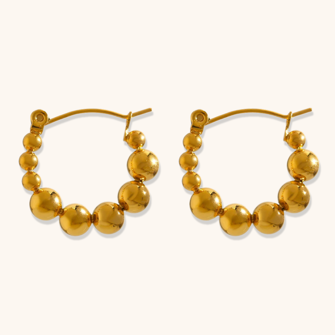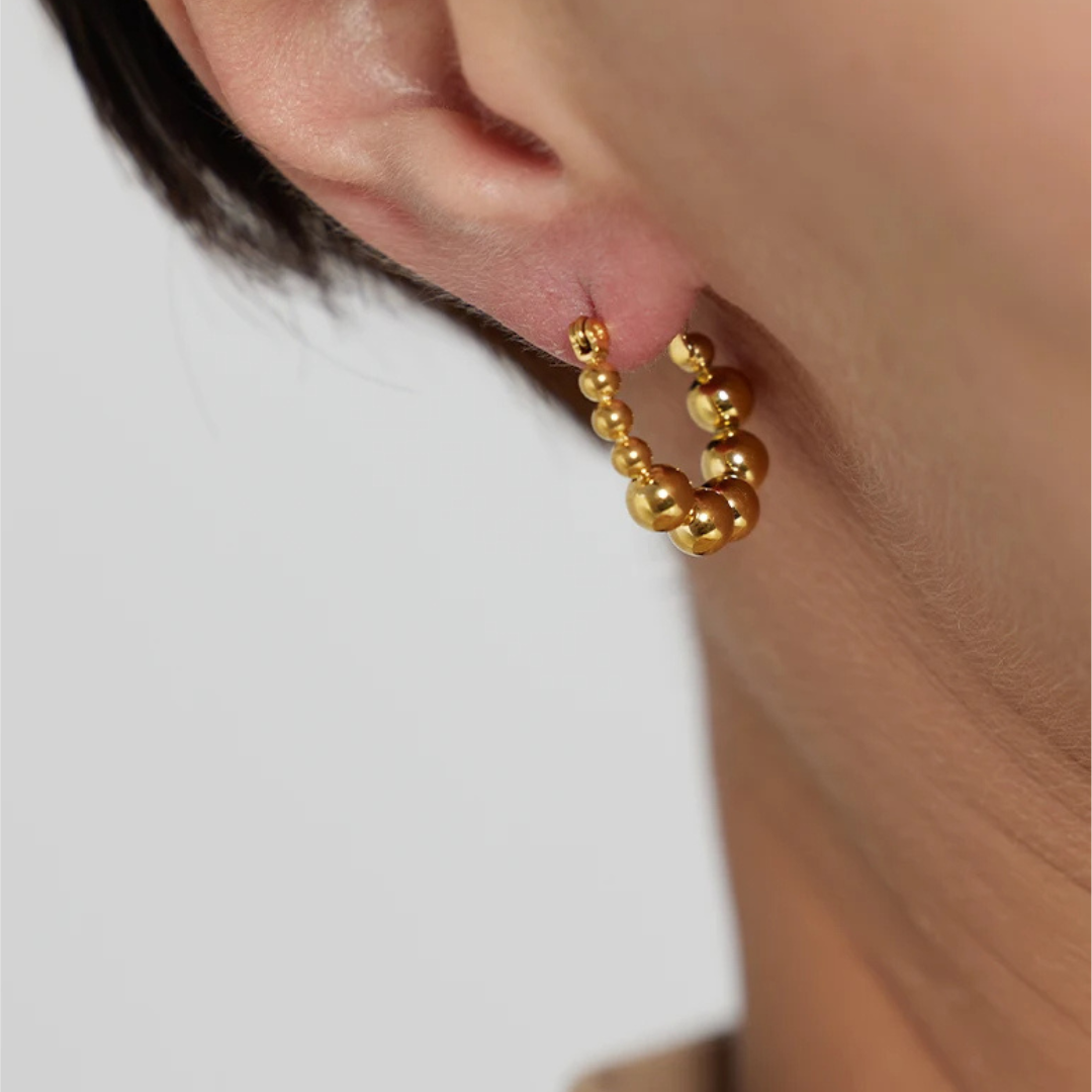 Ein skulpturales Paar runder Creolen mit glatten Goldperlen, die in einem abgestuften Bogen angeordnet sind. Kühn in der Form und dennoch leicht genug für den täglichen Gebrauch – diese Creolen setzen mühelos Akzente zu minimalistischen wie auch eleganten Outfits.