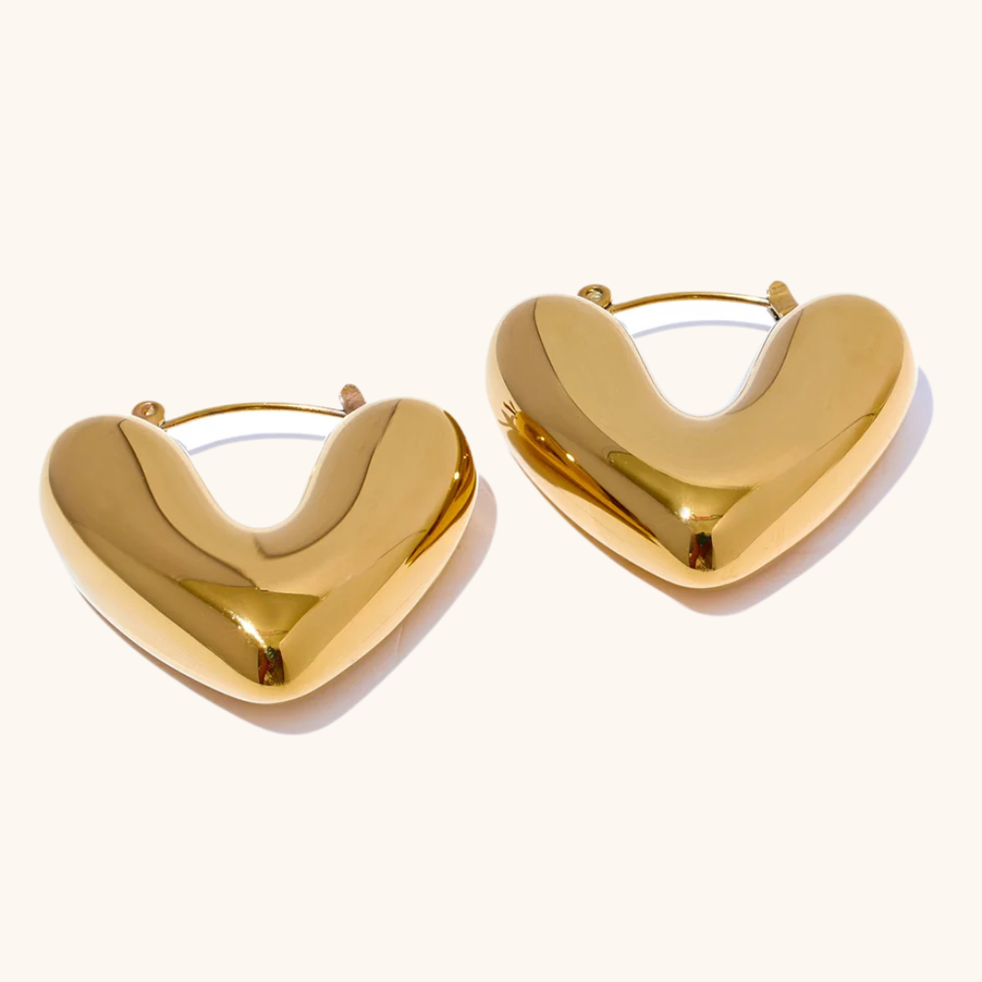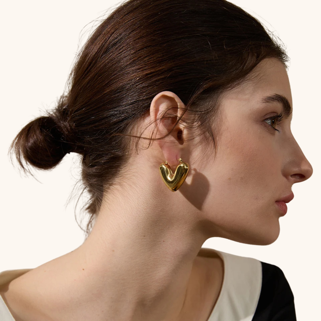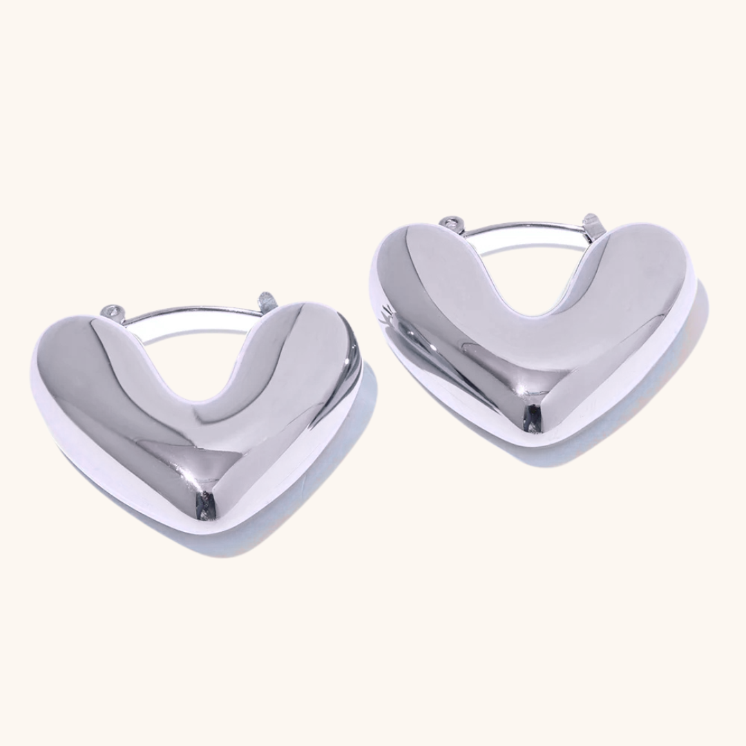 Ein auffälliges Paar Creolen in Form glatter, abgerundeter Herzen mit markanter Silhouette. Das skulpturale Design setzt ein modernes Statement und bleibt dabei leicht und angenehm zu tragen. Ein Hingucker-Accessoire, das sowohl lässige als auch elegante Looks aufwertet.