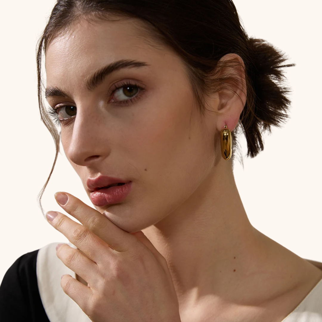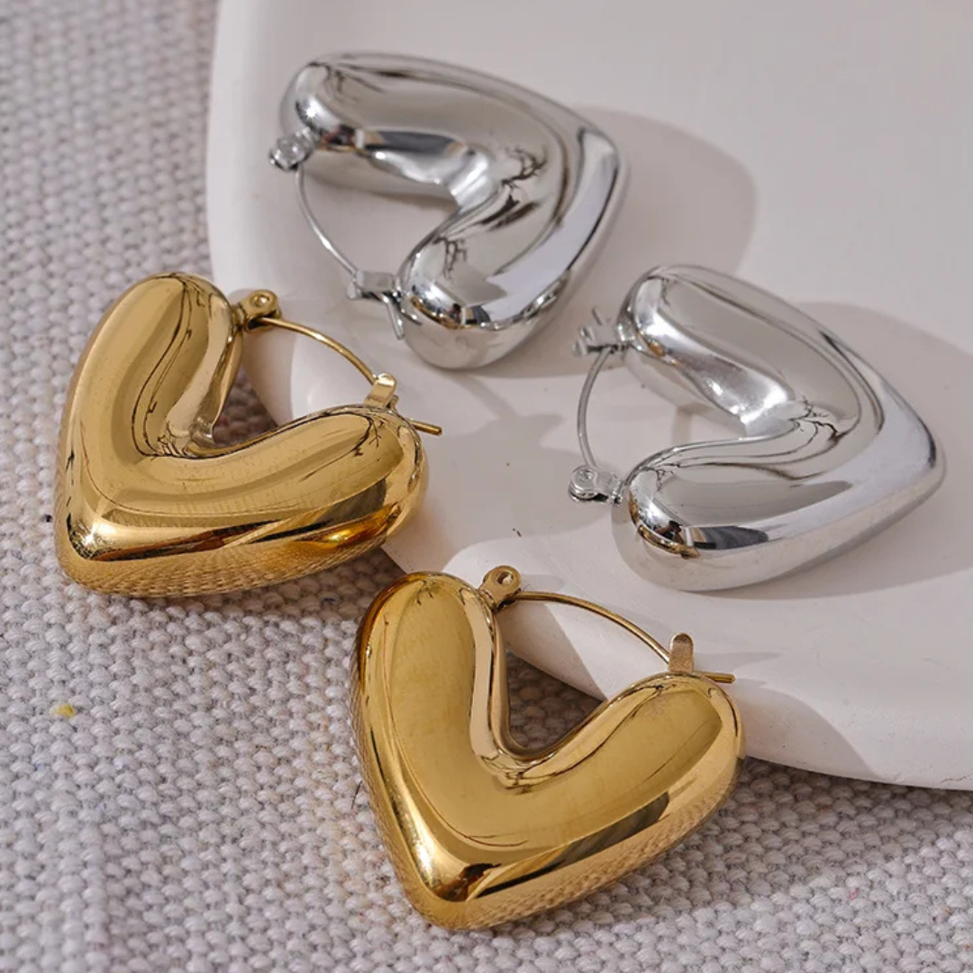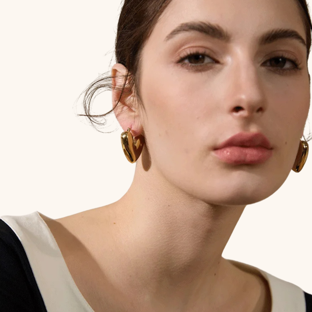 Ein auffälliges Paar Creolen in Form glatter, abgerundeter Herzen mit markanter Silhouette. Das skulpturale Design setzt ein modernes Statement und bleibt dabei leicht und angenehm zu tragen. Ein Hingucker-Accessoire, das sowohl lässige als auch elegante Looks aufwertet.