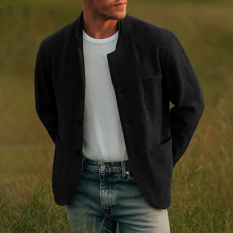 Diese Herren-Freizeitjacke präsentiert sich mit einer Knopfleiste vorne und einem geraden Schnitt. Das Design umfasst einen kurzen, kragenlosen Ausschnitt, lange Ärmel und zwei große aufgesetzte Taschen auf der Vorderseite. Gefertigt aus einem glatten Gewebe mit sauberen Nähten, verleiht diese Jacke einen gepflegten Look – ideal für lässige oder halbformelle Outfits.