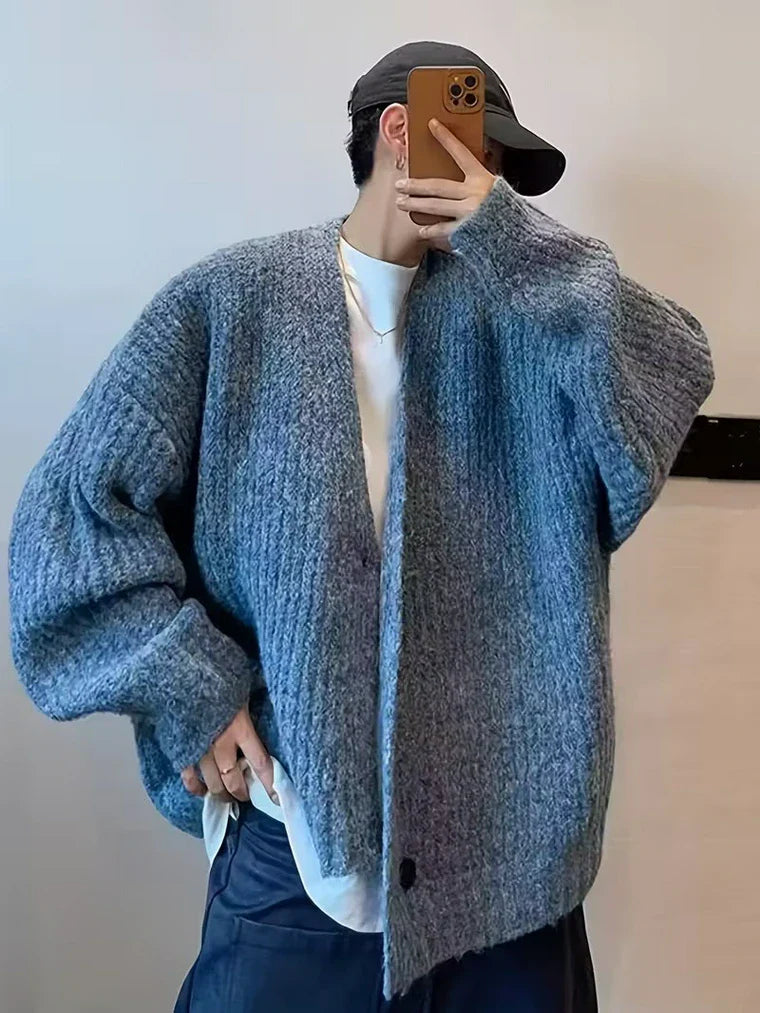 Diese Strickjacke verfügt über einen Knopfverschluss mit weit auseinander liegenden Knöpfen auf der Vorderseite. Der Körper und die Ärmel sind aus Strick gefertigt. Der Ausschnitt hat einen flachen Saum, der sich entlang der Vorderkanten erstreckt. Der Stoff ist gerippt.
