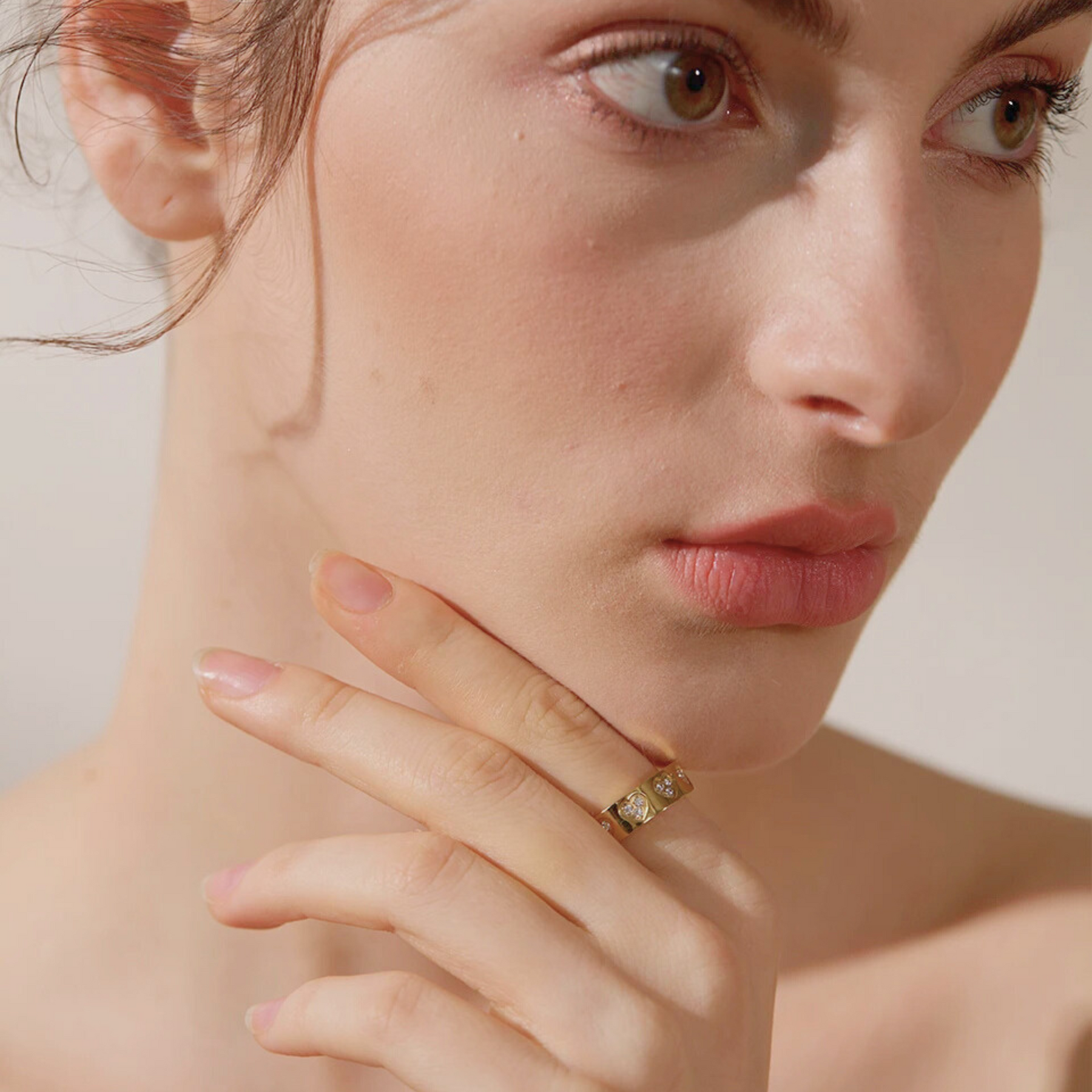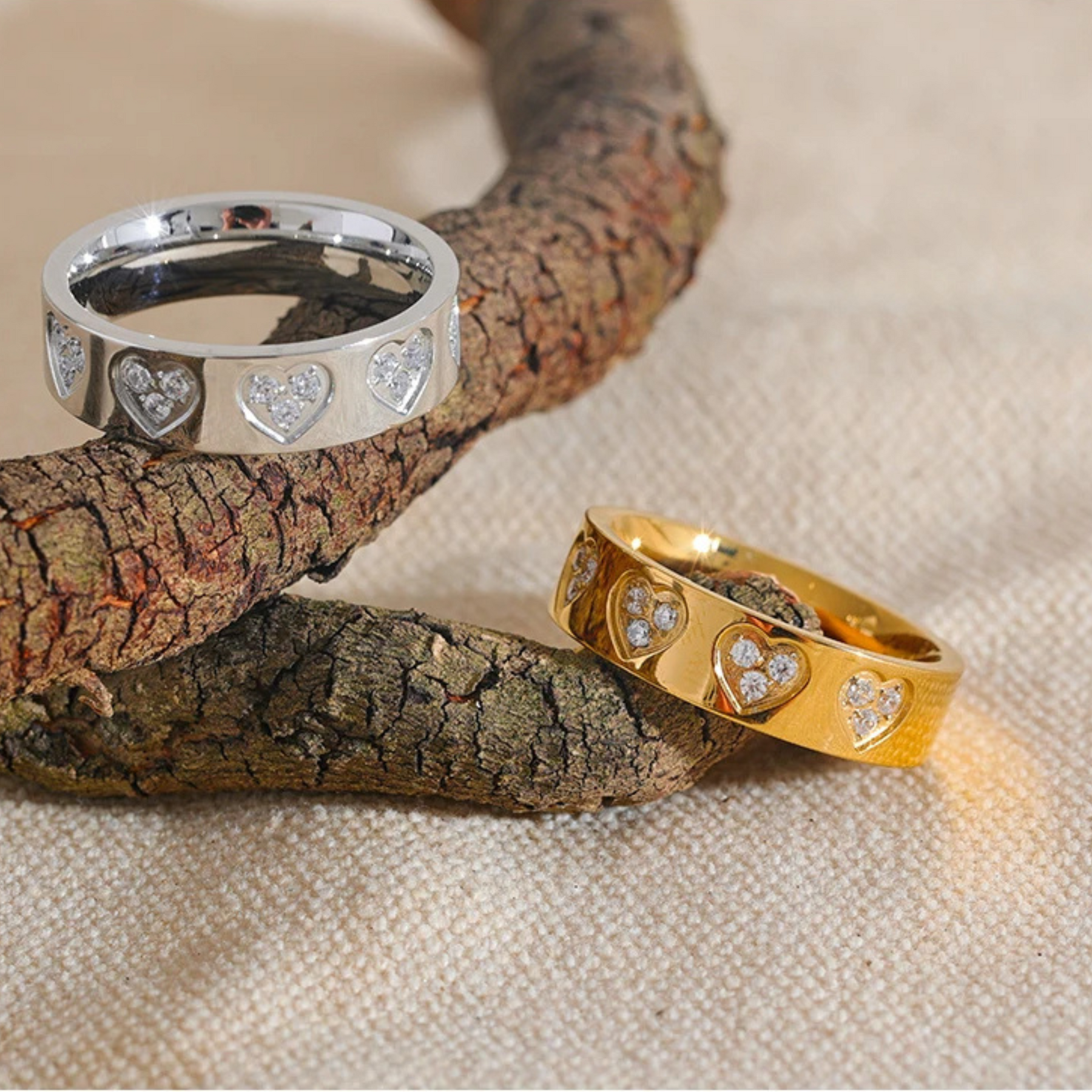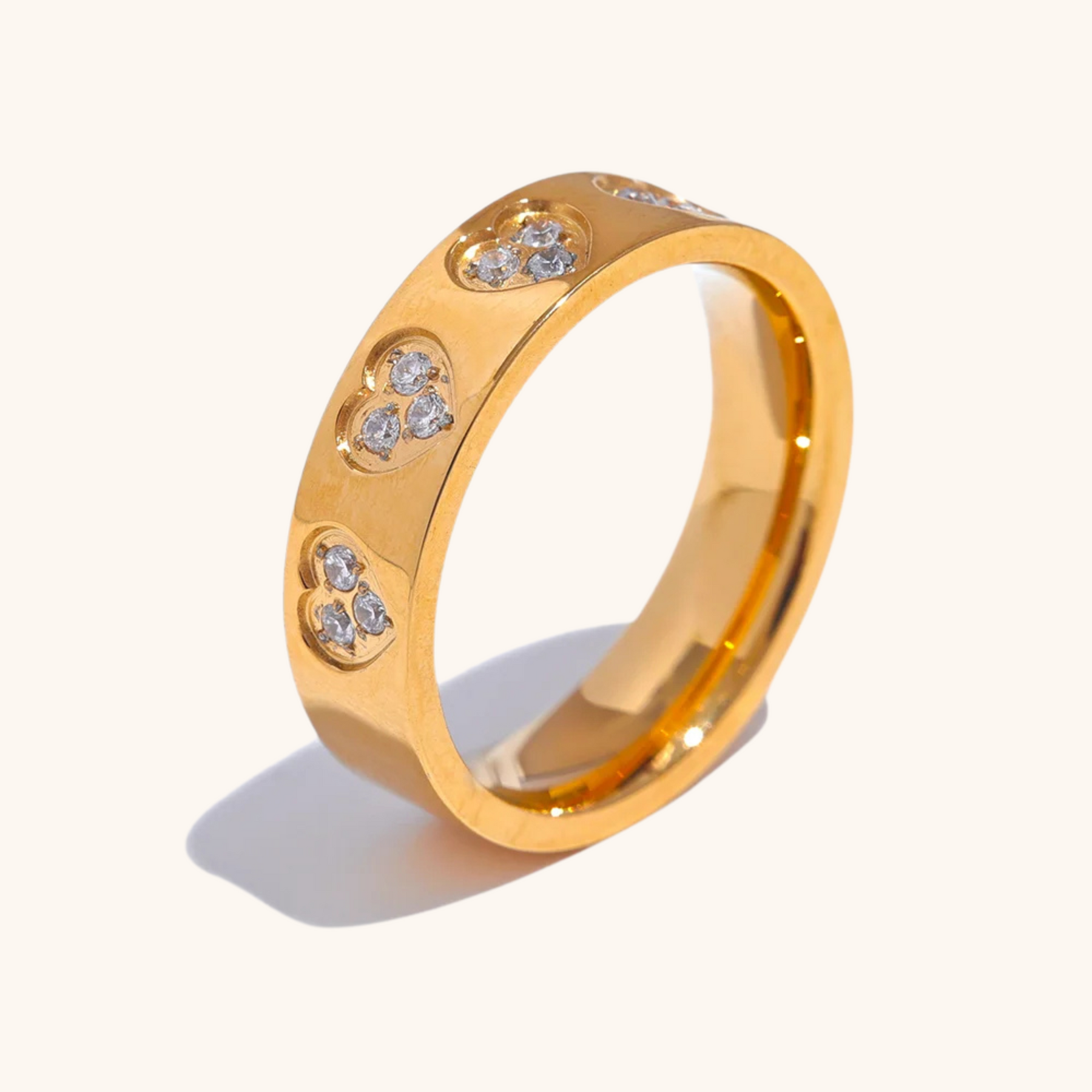 Ein schlanker Bandring mit kleinen Herzakzenten, die in einer klaren Reihe angeordnet sind und genau die richtige Portion Glanz verleihen. Leicht, ausgewogen und angenehm zu tragen — perfekt, um deinem Alltagslook eine verspielte Note zu geben.