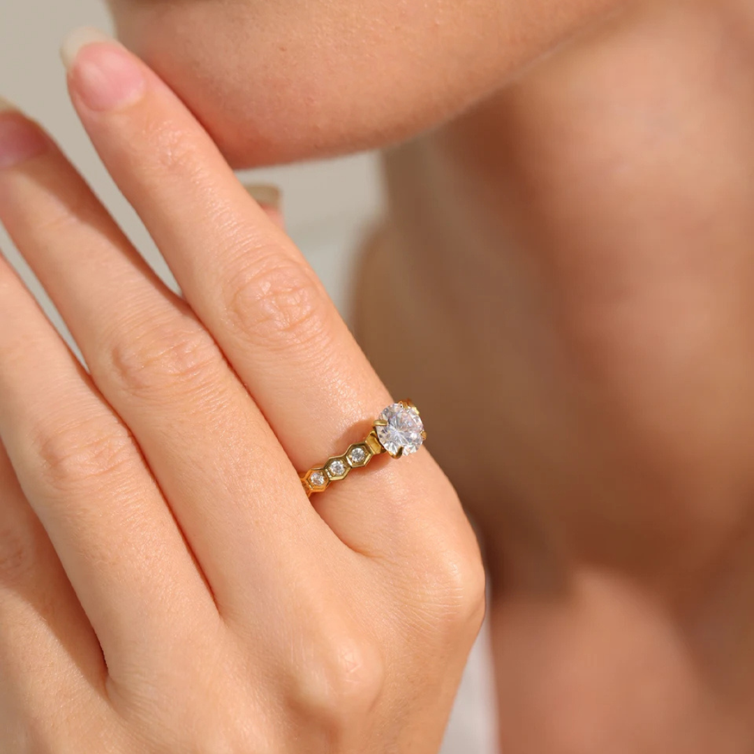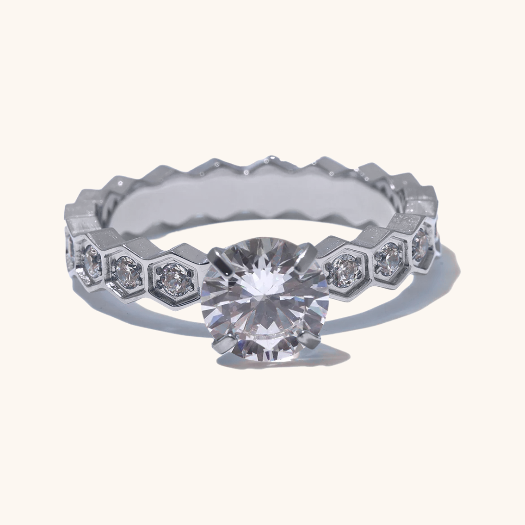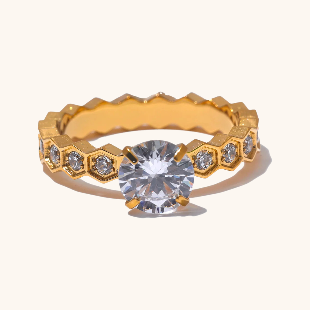 Ein auffälliger Ring mit markantem rundem Stein und sechseckigen Seitenakzenten. Das mehrlagige Band und die klaren Details verleihen ihm einen strukturierten Look, der sowohl solo als auch im Stack getragen werden kann.