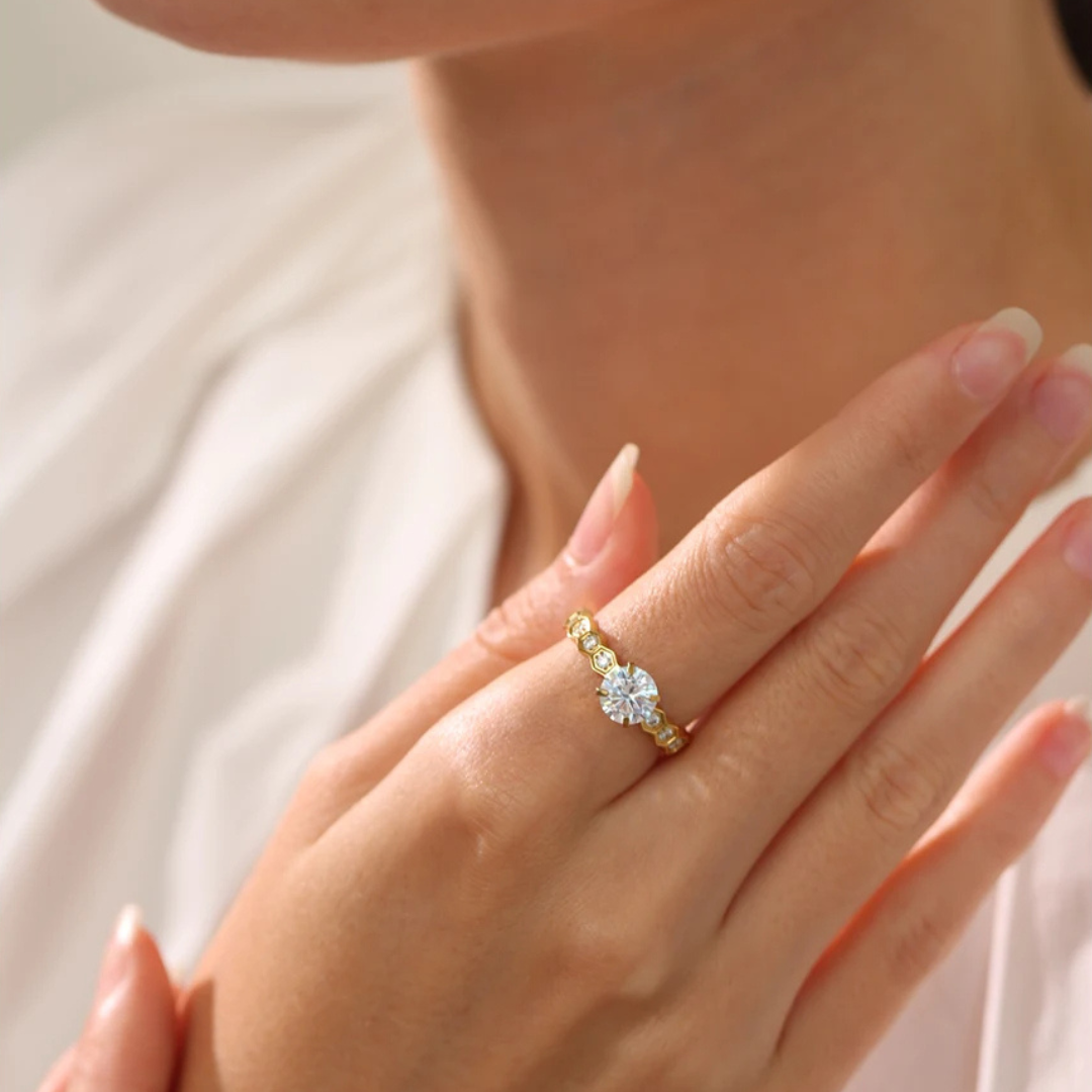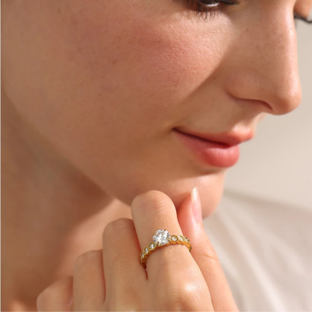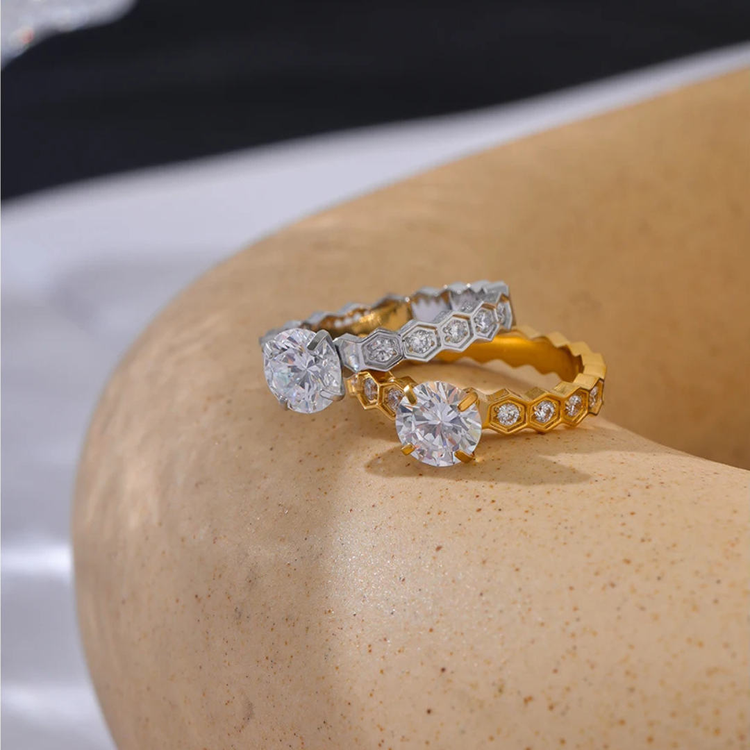 Ein auffälliger Ring mit markantem rundem Stein und sechseckigen Seitenakzenten. Das mehrlagige Band und die klaren Details verleihen ihm einen strukturierten Look, der sowohl solo als auch im Stack getragen werden kann.