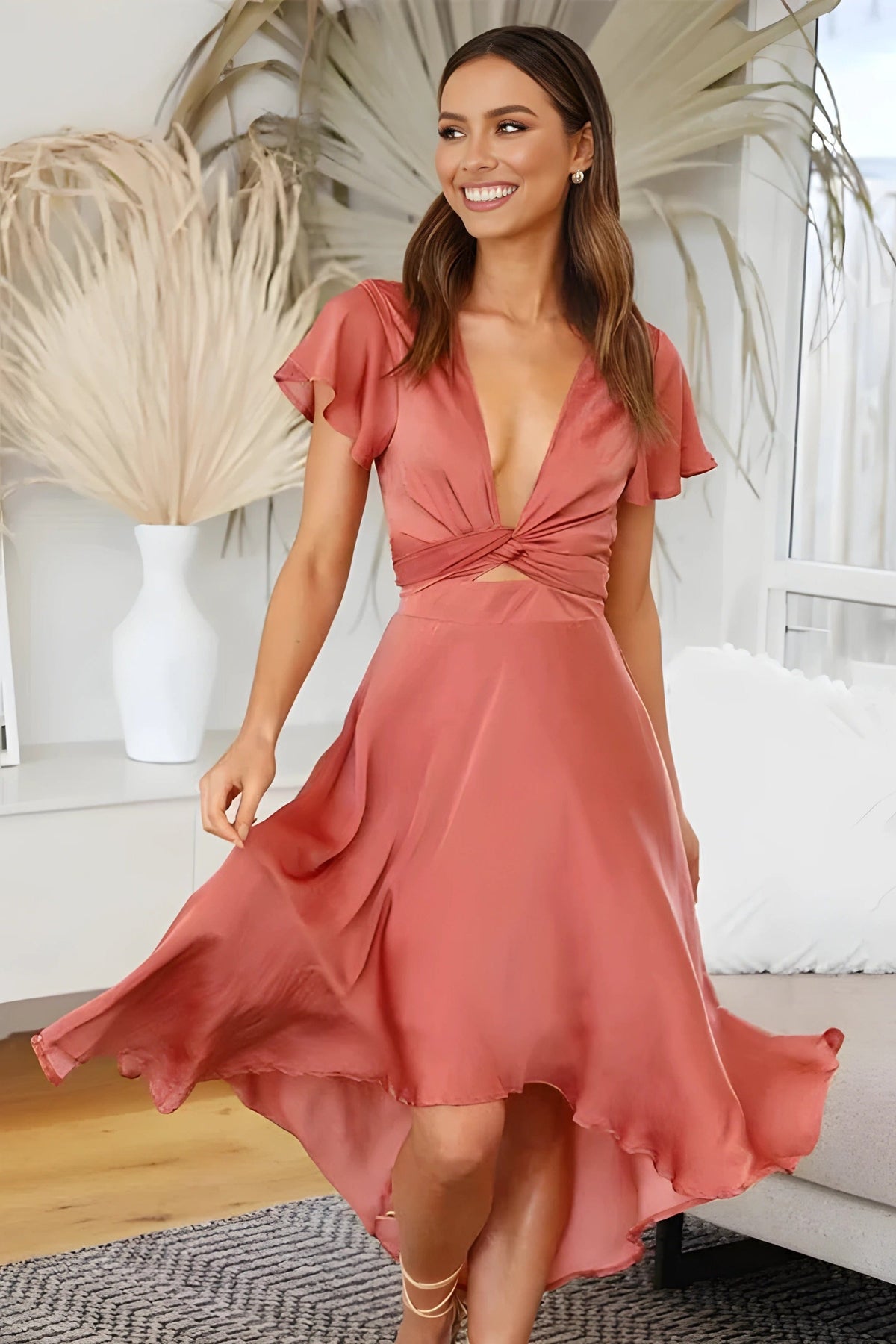 Das Janina Kleid verführt mit einem fließenden Schnitt, einem tiefen V-Ausschnitt und einem eleganten Knotendetail unter der Brust. Es vereint raffiniertes Design mit alltagstauglichem Komfort – und wird schnell zum Lieblingsstück für warme Tage, Gartenpartys oder stilvolle Spaziergänge.