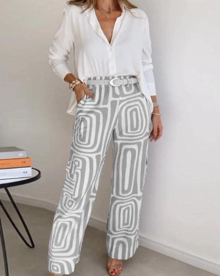 - Gestaltung: Zeitlos weiße Bluse mit klassischem Kragen & stilvoll gemusterter Hose