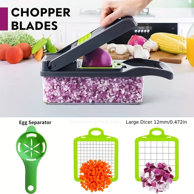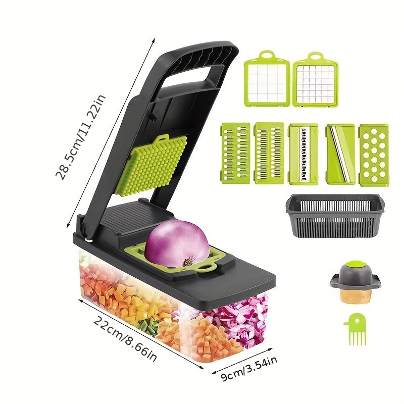 Die Gemüseschneidemaschine ist mit einem ergonomischen Griff und einer Zwiebelfleischmühle ausgestattet, was Ihnen ein effizientes und zeitsparendes Kocherlebnis ermöglicht.