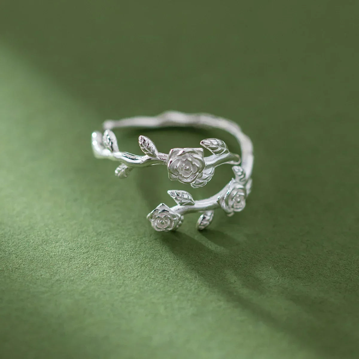 Rankende Weinreben umschließen blühende Rosen in einem strahlenden Motiv, in dem botanische Schönheit in einer edlen metallischen Form verewigt ist.