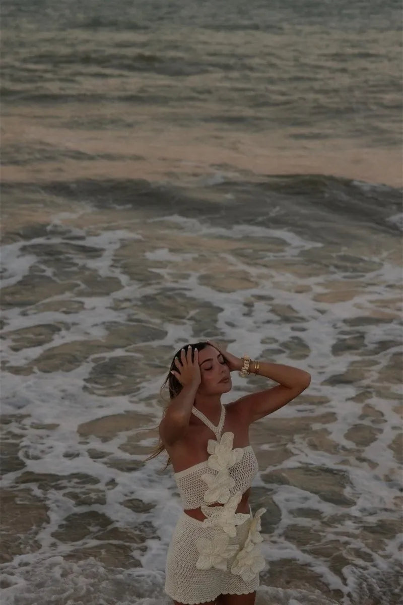 Du bindest den Neckholder, das feine Häkelmuster legt sich sanft auf deine Haut, und du fühlst dich sofort wohl in deiner Eleganz. Das Livia™ Minikleid verbindet verspielte Blumenstrick-Details mit einem figurschmeichelnden Schnitt – ideal für sonnige Tage, stilvolle Brunches oder Nächte, die in Erinnerung bleiben.
