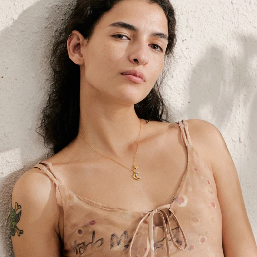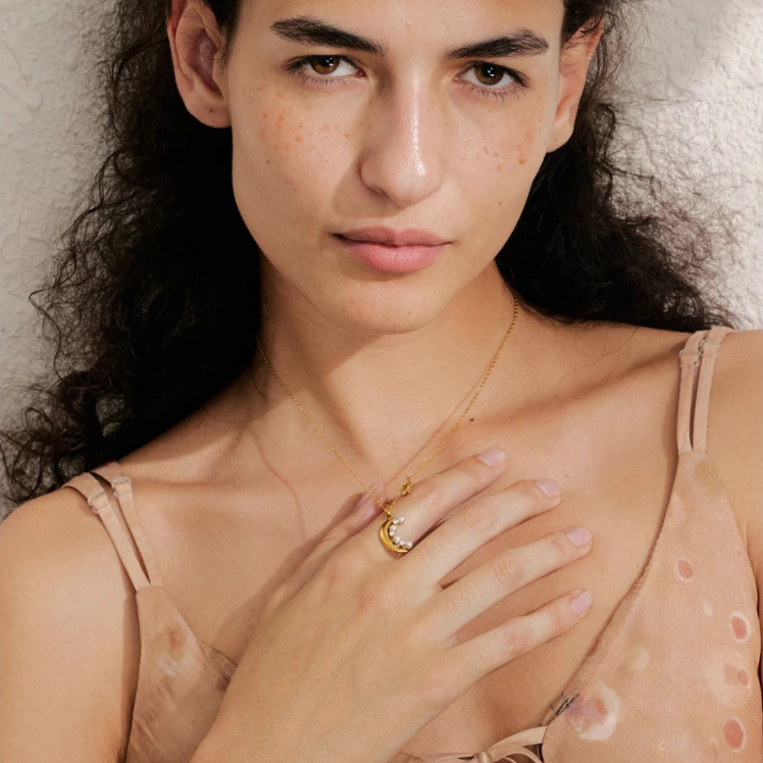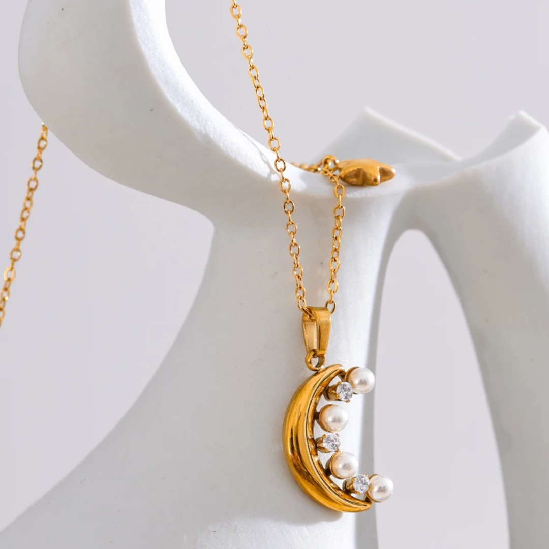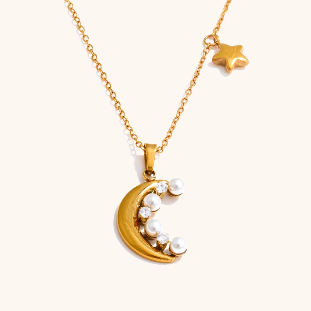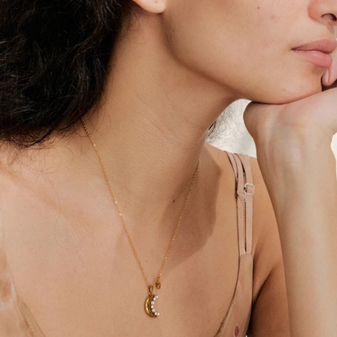 Eine zarte Halskette mit einem Halbmond-Anhänger, verziert mit perlenähnlichen Akzenten und einem kleinen Stern-Charme. Leicht und auffällig — perfekt zum Layern oder solo getragen. Passt hervorragend zu lässigen wie auch eleganten Outfits.