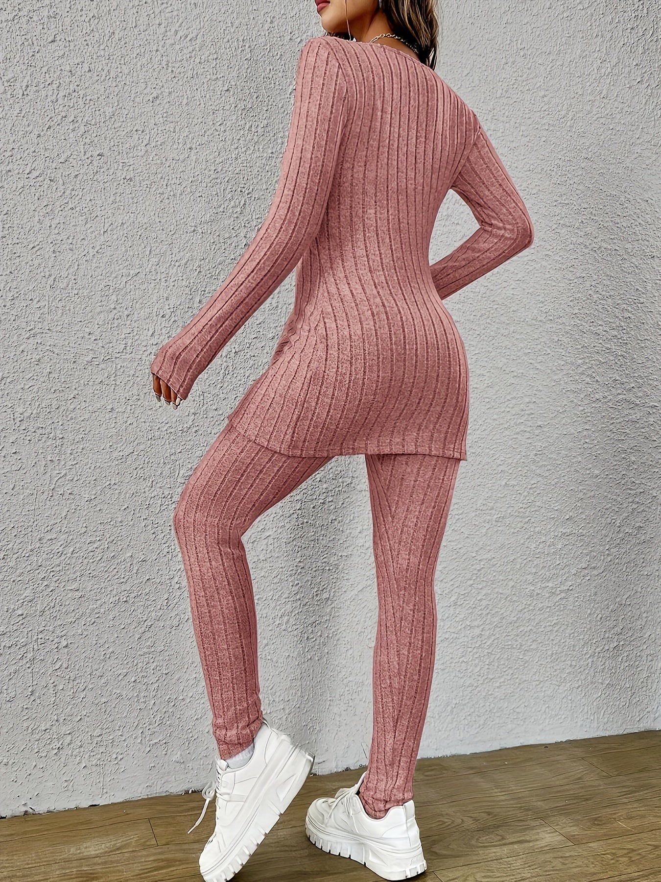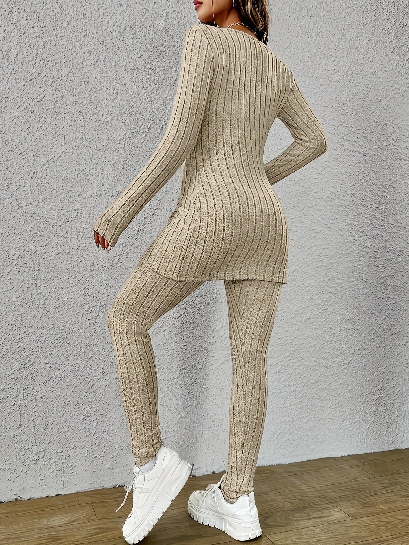 Gönnen Sie sich modisches Flair mit dem Marie Matching Two-Piece Set - ein fesselndes Ensemble im trendigen Rippenteil-Design, bestehend aus einem lässigen T-Shirt und einer langärmeligen Hose. Dieses tadellos gefertigte Kleidungsset für Damen zeigt ein unifarbenes Muster für einen Hauch von moderner Raffinesse und sorgt dafür, dass Sie in jeder Menge auffallen.