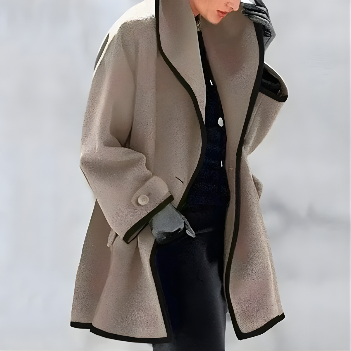 Der Miranda Klassischer Mantel ist ein unverzichtbares Oberbekleidungsstück, das gepflegten Stil und eine schmeichelhafte A-Linien-Form bietet. Dieser Mantel verfügt über einen markanten, breiten Stehkragen und einen Knopfverschluss vorne. Er wird durch seine kontrastierende schwarze Paspelierung an den Kanten und Taschen definiert, die einen scharfen, raffinierten visuellen Kontrast schafft.