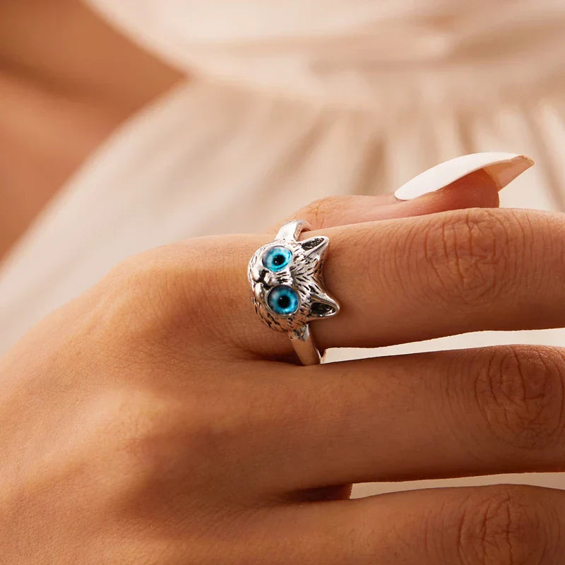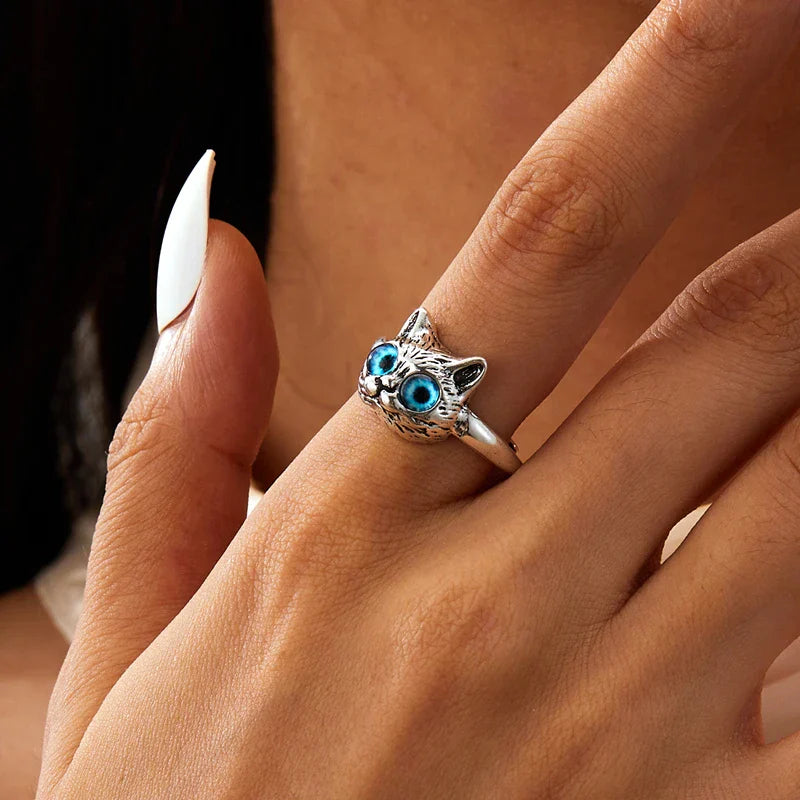 Stechend blaue Augen, eingefroren in Silber. Dieser skulpturale Katzenring vereint verspielten Charme mit markanten Details – vom strukturierten Fell bis zum hypnotischen Emaille-Blick. Ein wenig wild, ein wenig neugierig – genau wie deine Lieblingskatze.
