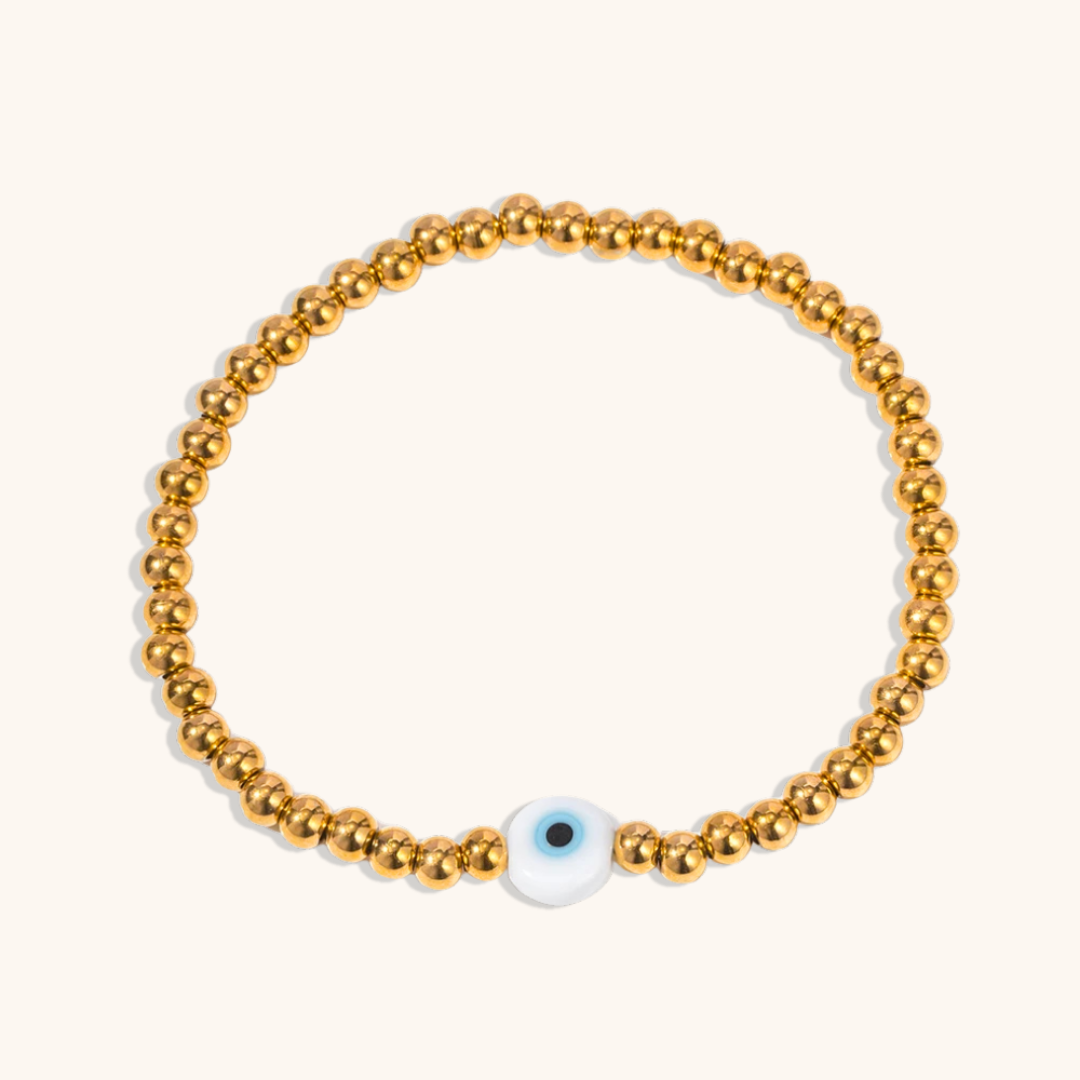Ein schlichtes und charmantes Armband mit goldfarbenen Perlen und einem einzelnen „Evil Eye“-Akzent in der Mitte. Das dehnbare Band lässt sich leicht an- und ausziehen, während das klare Design zu jedem Outfit passt – ob tagsüber oder abends.