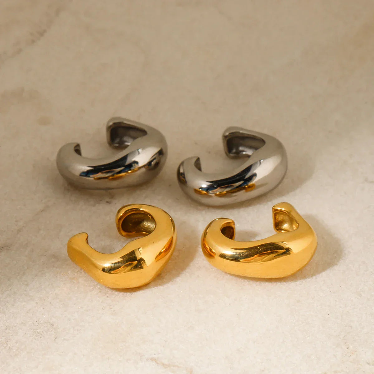 Ein skulpturales Design mit doppelter Lage – diese Ear Cuffs verleihen einen kühnen, polierten Look, ganz ohne Piercing. In Gold- und Silberoptik gefertigt, schmiegen sie sich in einer glatten, geschwungenen Form ans Ohr und eignen sich perfekt zum Kombinieren oder Solo-Tragen.