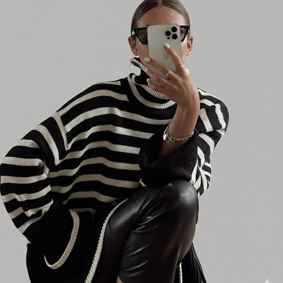 Das schwarz-weiße Streifendesign und der hohe Kragen verleihen dem Look eine moderne, edle Note.