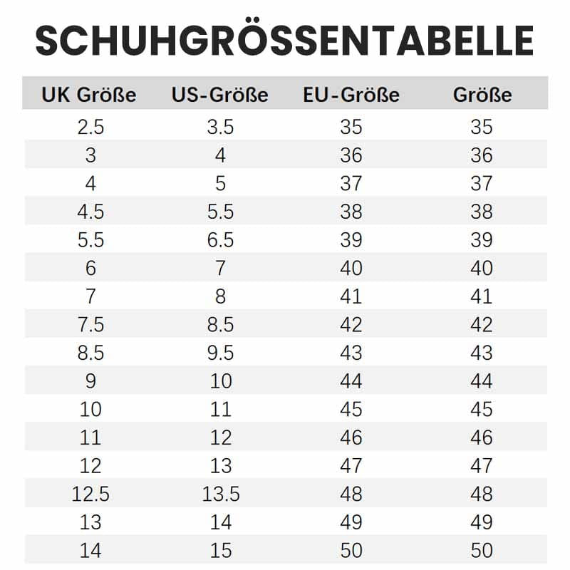 | EU-Größe | UK-Größe | US-Größe | Fußlänge (cm) |