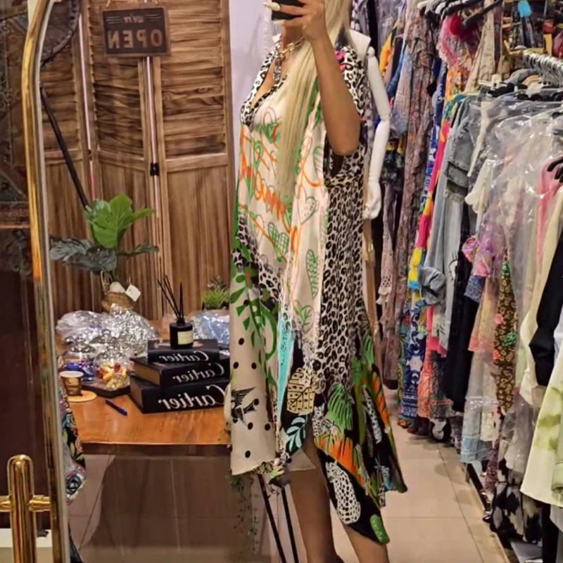 Paulina® | Bedrucktes Damenkleid mit kurzen Ärmeln und tiefem V-Ausschnitt