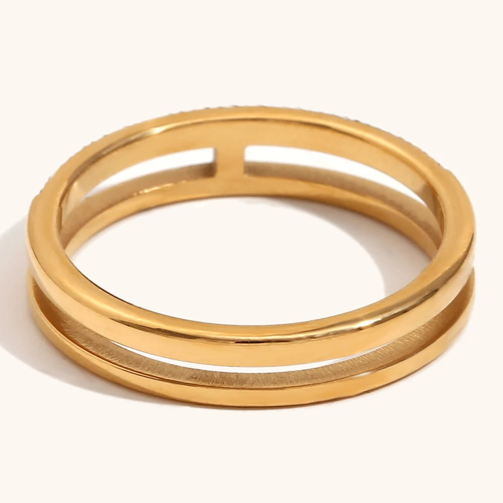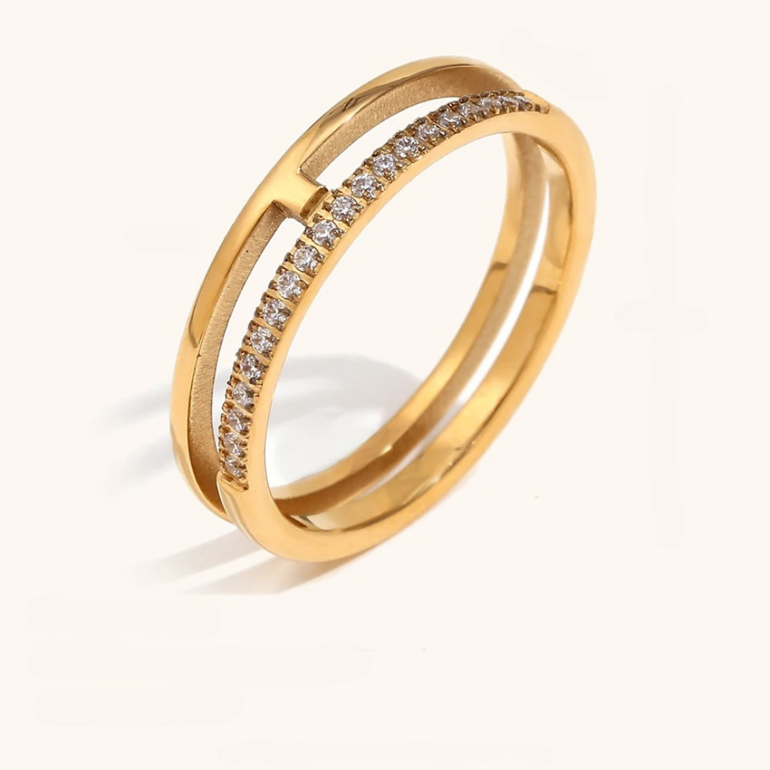 Ein schlanker, leichter Ring mit doppellagiger Form und einer Reihe klarer Steine an der Oberseite. Minimalistisch, aber detailreich — sieht sowohl solo als auch im Stack mit anderen Ringen gut aus.