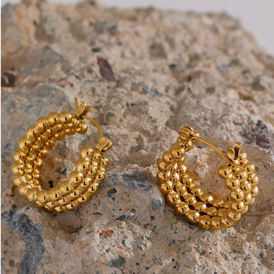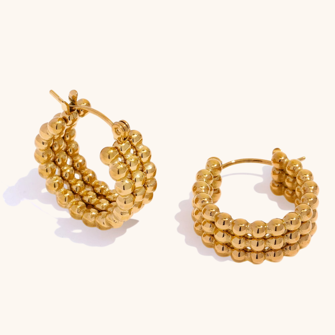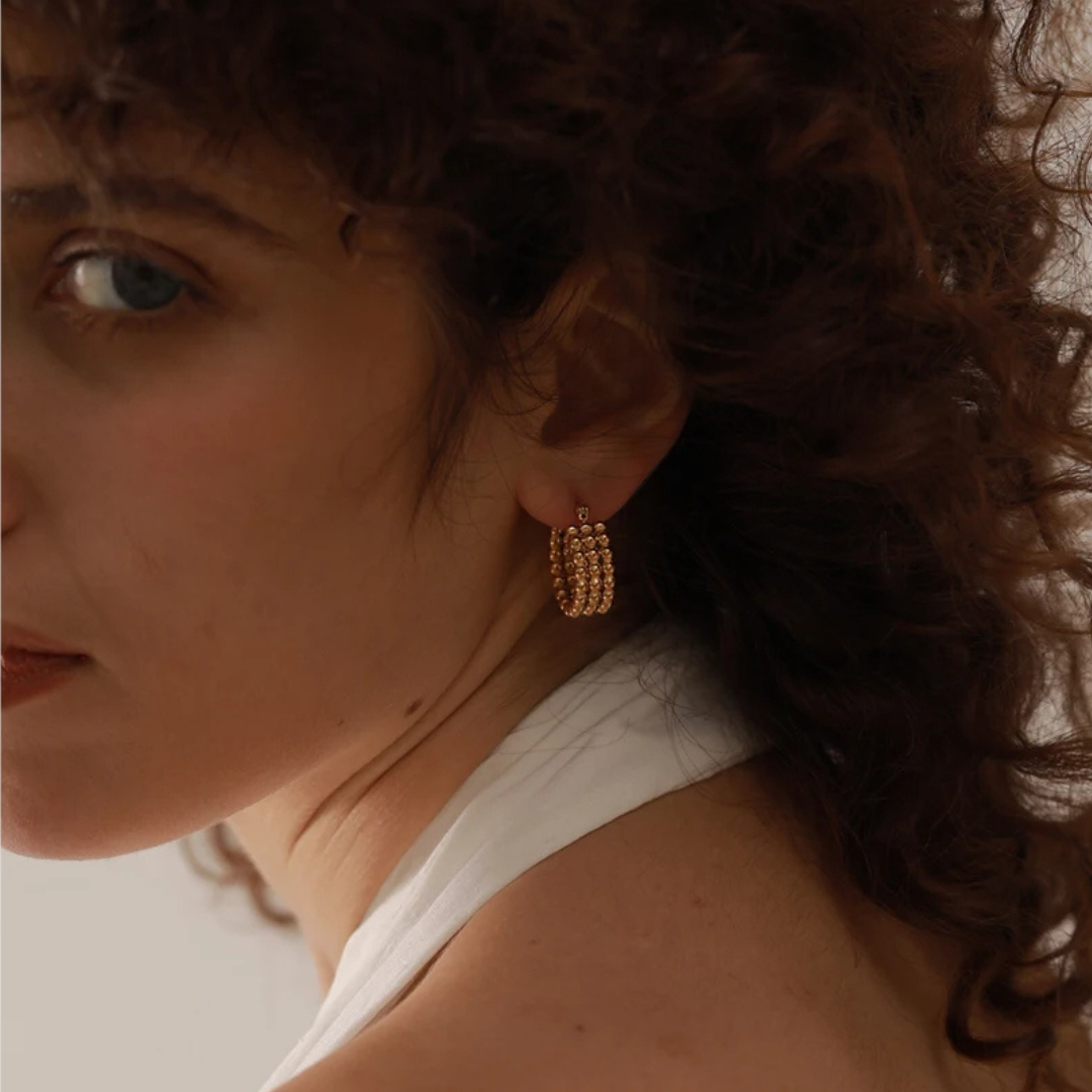 Ein verspieltes und zugleich elegantes Paar Creolen, mit übereinanderliegenden Perlensträngen für eine markante Textur. Ihr leichtes Tragegefühl und die glatte Politur machen sie zur idealen Wahl für mühelosen Alltagsstil.