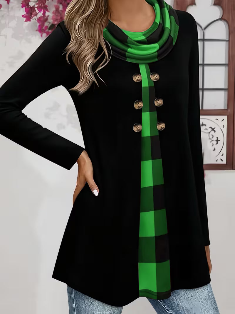 ✅Eleganter Zweiteiler-Schau: Das Sahar-T-hemd mit gerüschtem Kragen wurde so gestaltet, dass es wie ein Zweiteiler wirkt, und sorgt für sofortige Eleganz ohne zusätzliche Volumen. Der karierte Akzent und die dekorativen Knöpfe sorgen für einen raffinierten, stilvollen Schau und machen es perfekt für Frauen, die mühelose Eleganz mit alltäglichem Komfort verbinden möchten.