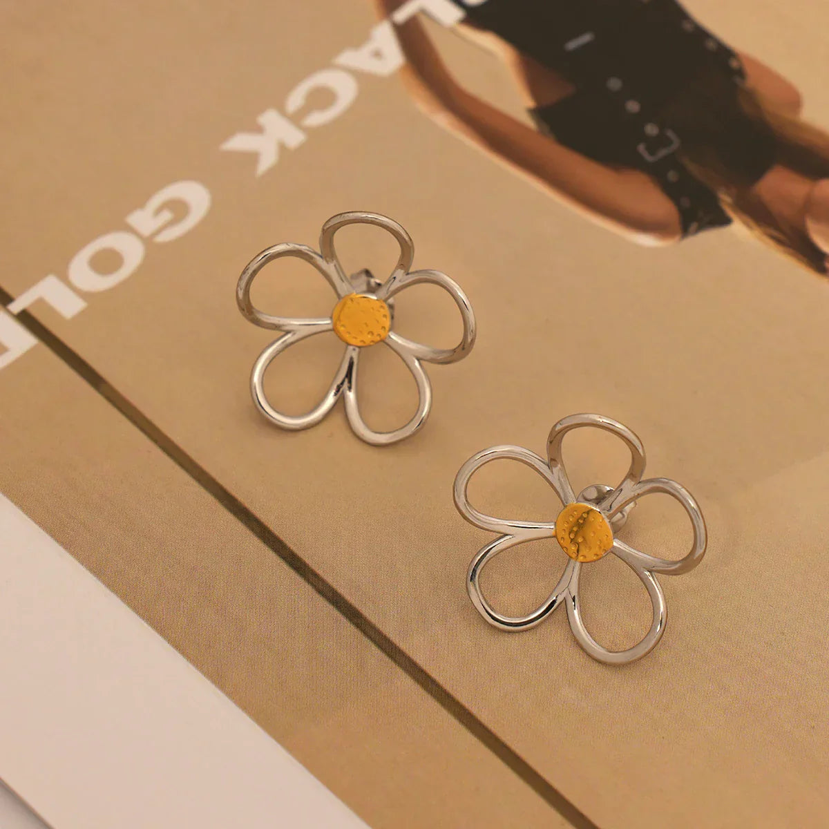 Ein durchbrochenes Blumendesign aus Sterlingsilber mit geformten Blütenblättern und einem strukturierten Mittelteil in Goldoptik. Das Zusammenspiel der Metalle und die organische Form verleihen ihm eine sanfte, natürliche Eleganz.