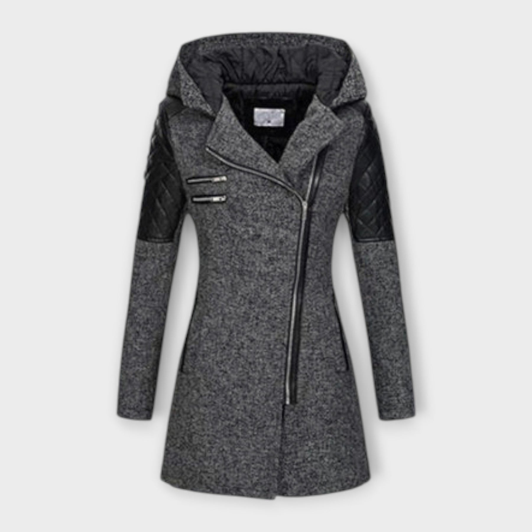 Sophia vereint modernes Design mit funktionaler Wärme. Der Mantel besticht durch seine klare Linie und die Kombination aus Stoff und Leder-Optik an den Ärmeln, die ihm einen urbanen Charakter verleihen. Die Kapuze und der asymmetrische Reißverschluss runden den Look ab und machen ihn zum Hingucker in der kalten Jahreszeit.