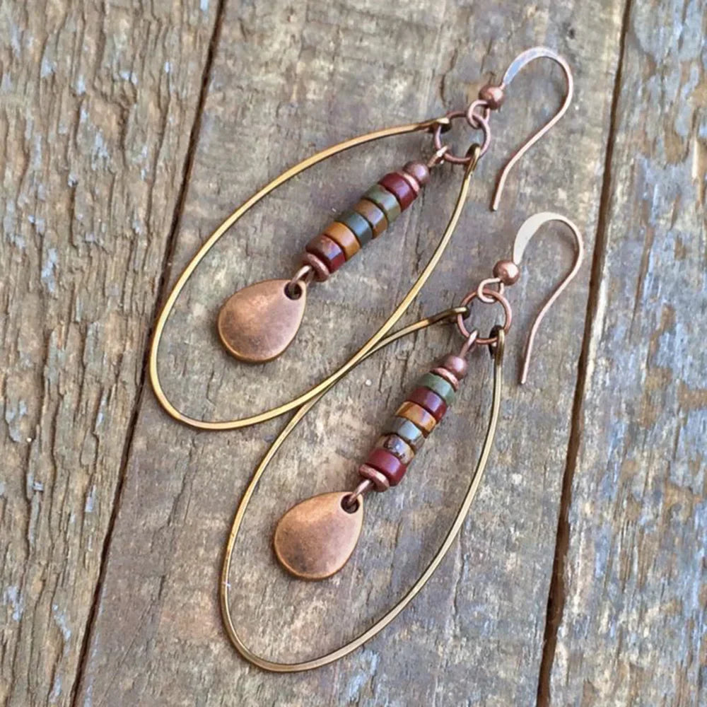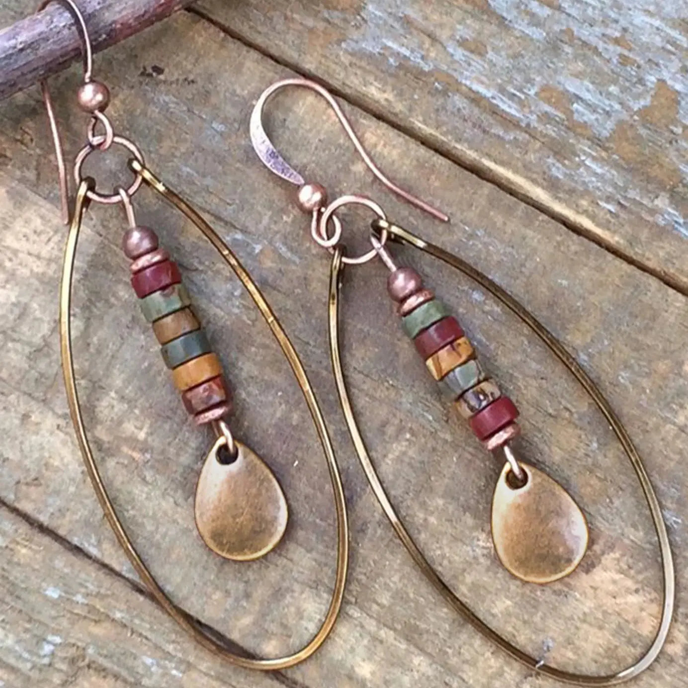 Ovalförmige Ohrringe in Messingoptik mit gestapelten steinähnlichen Perlen und einem tropfenförmigen Anhänger, gestaltet in einer frei schwingenden, offenen Rahmenform.