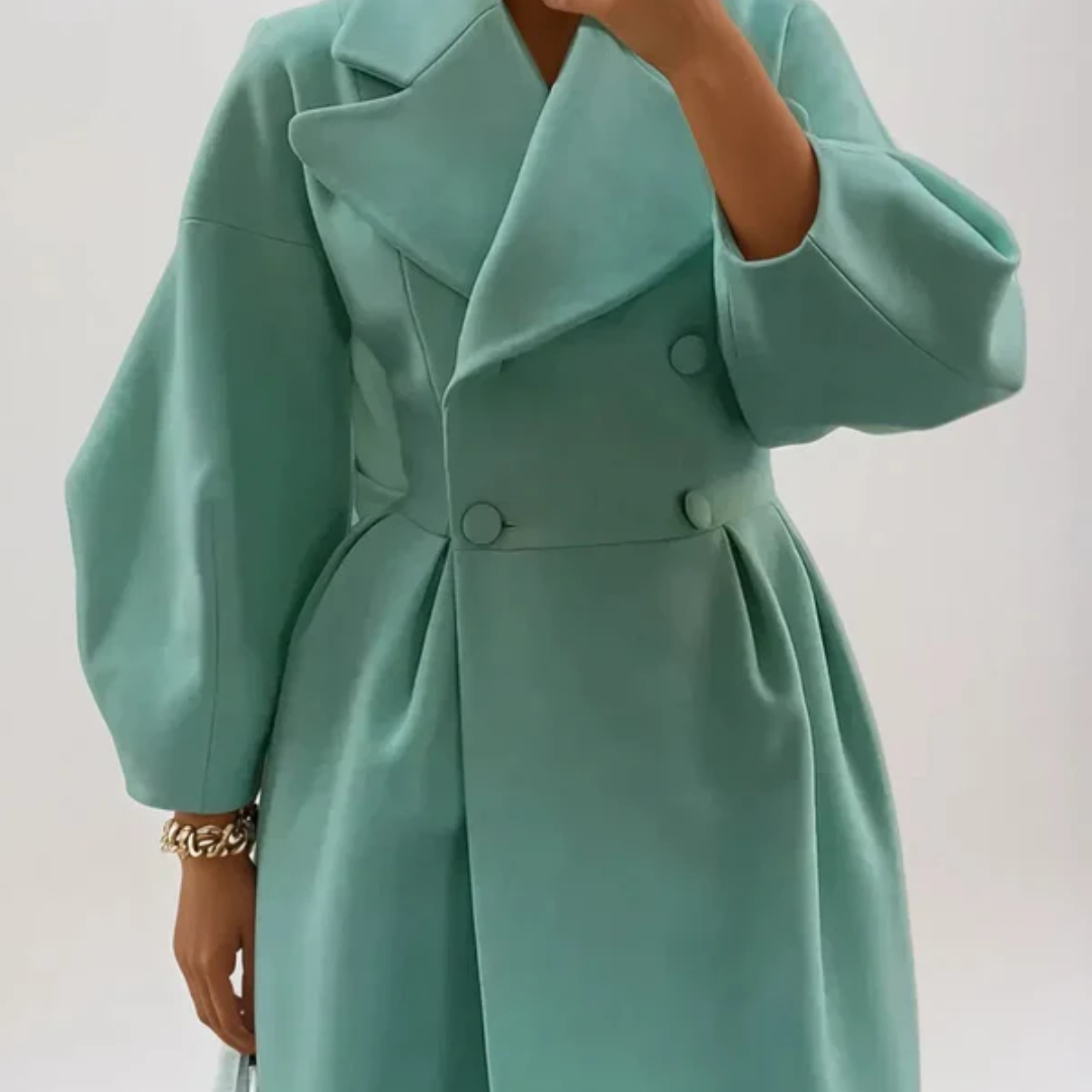 Dieser stilvolle Wollmantel zeichnet sich durch seinen doppelreihigen Schnitt und die raffiniert geschnittenen Ärmel aus, die für eine außergewöhnlich feminine Silhouette sorgen. Der großzügige Reverskragen verleiht dem Mantel zusätzliche Eleganz, während der taillierte Schnitt die Figur perfekt zur Geltung bringt. Ideal für elegante Anlässe oder stilvolle Alltagslooks.