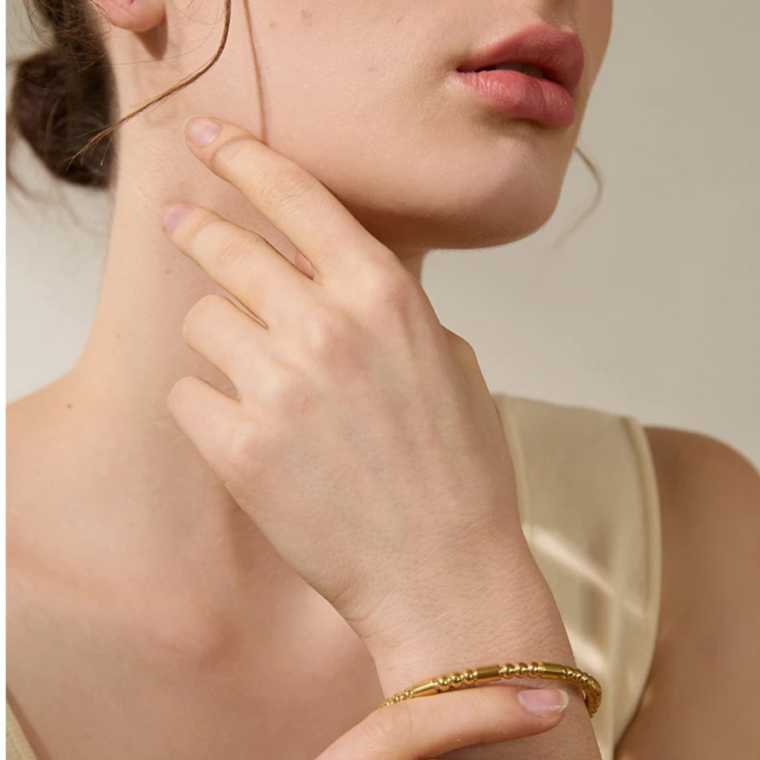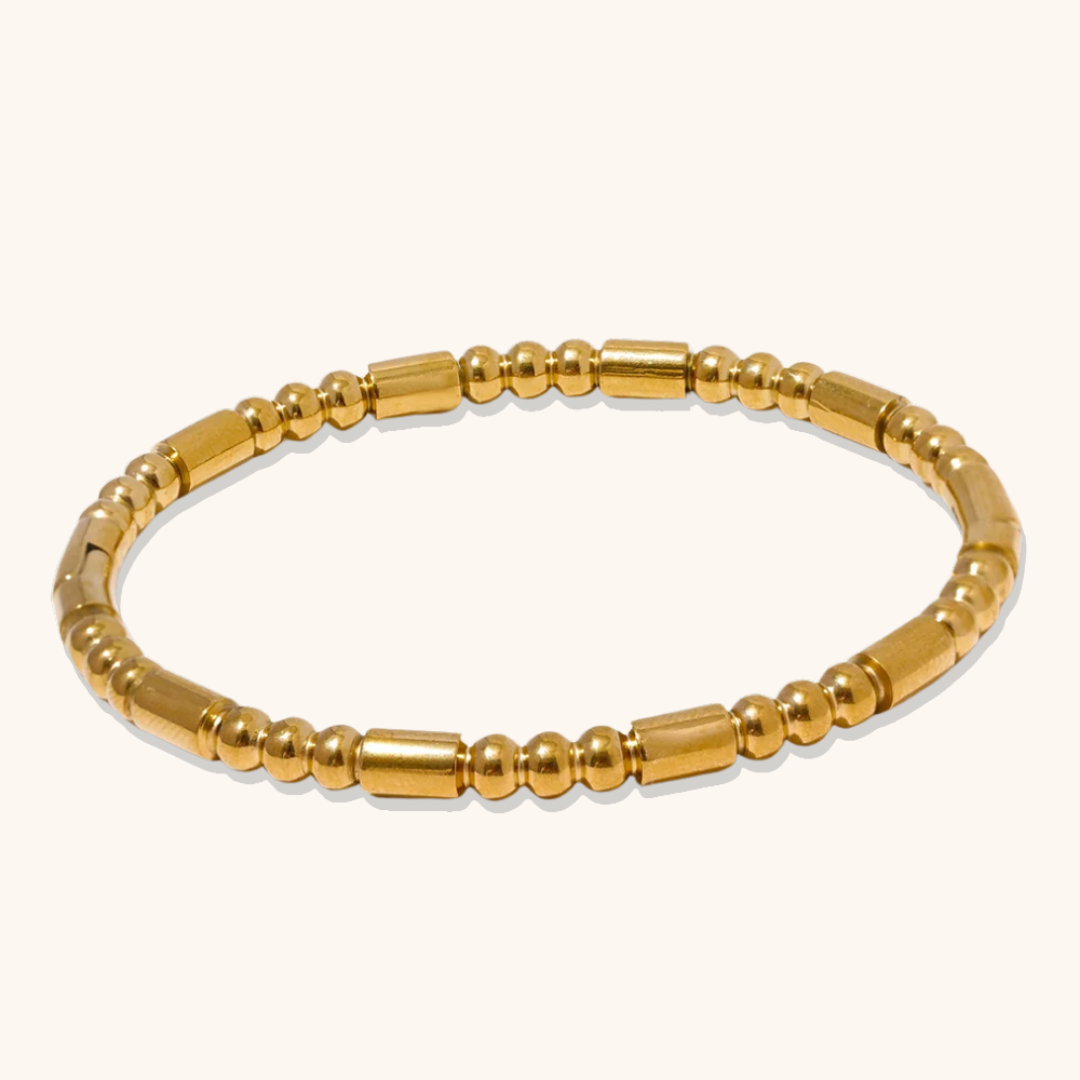 Ein schlanker und minimalistischer Perlenarmreif mit einer Mischung aus zylindrischen und runden Perlen. Für einen zeitlosen Look entworfen – perfekt zum Kombinieren oder solo getragen.