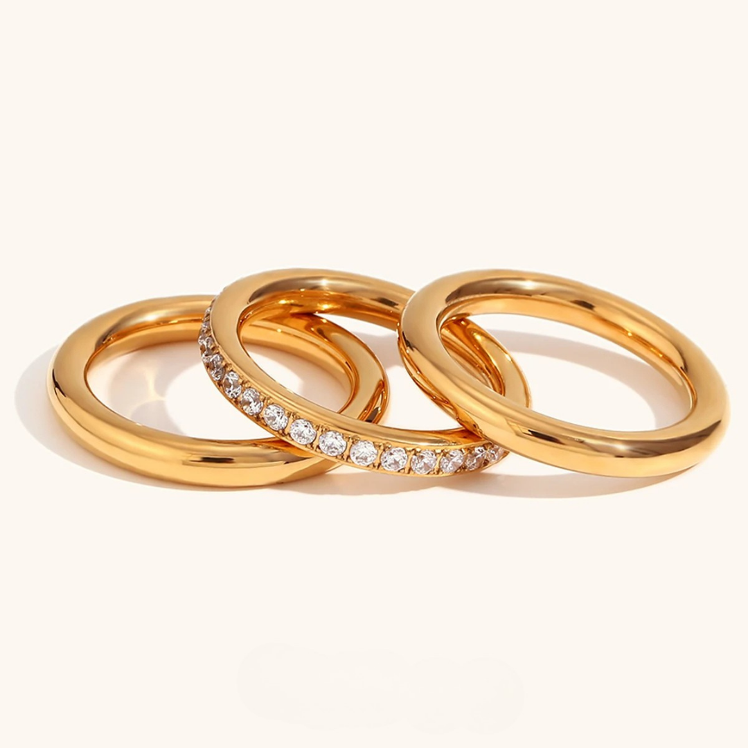 Ein markantes und zeitloses 3-teiliges Ringset, das jeden Look aufwertet. Mit zwei polierten Bändern und einem Pavé-Band mit funkelnden Zirkonia-Steinen verleiht jeder Ring deinem Alltagsoutfit ein edles Finish.